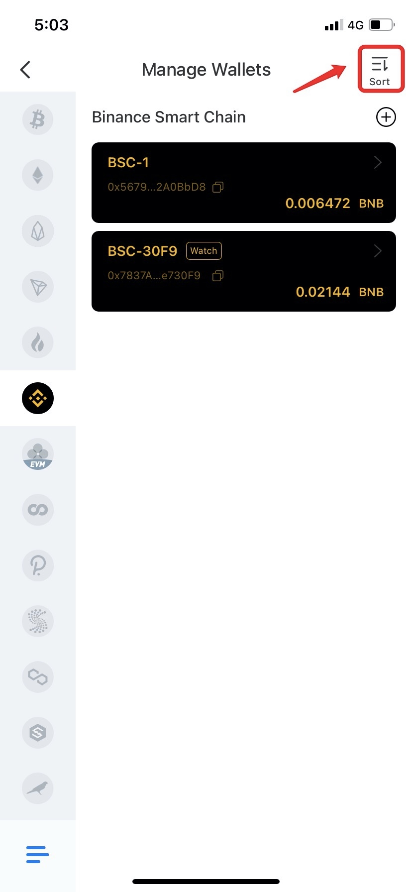 2. Click [Sort] button in the upper right corner to sort multiple wallets;