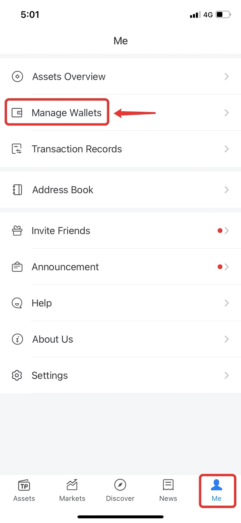 1.Open TokenPocket App, click on [Me], and then click [Manage Wallets];