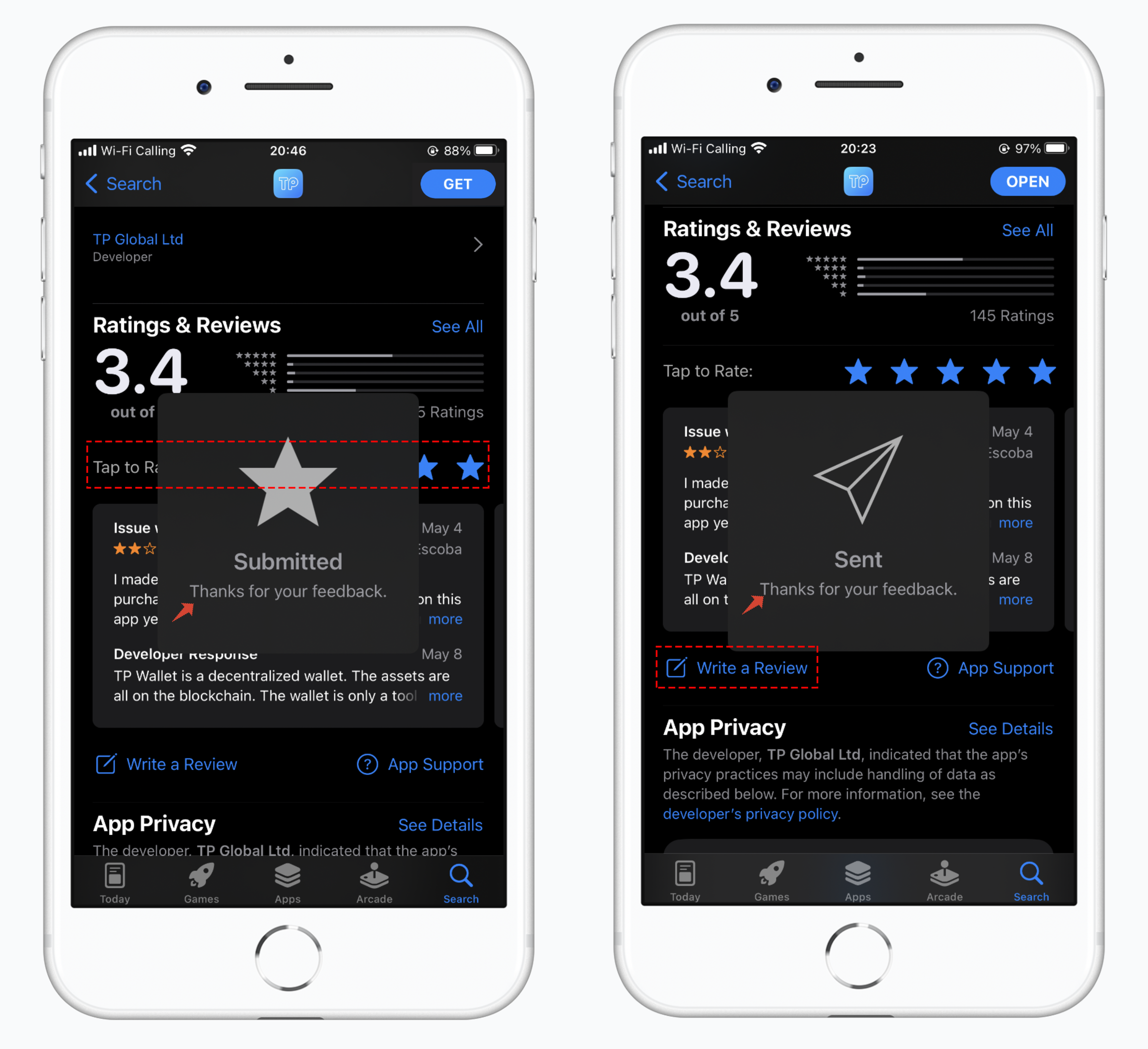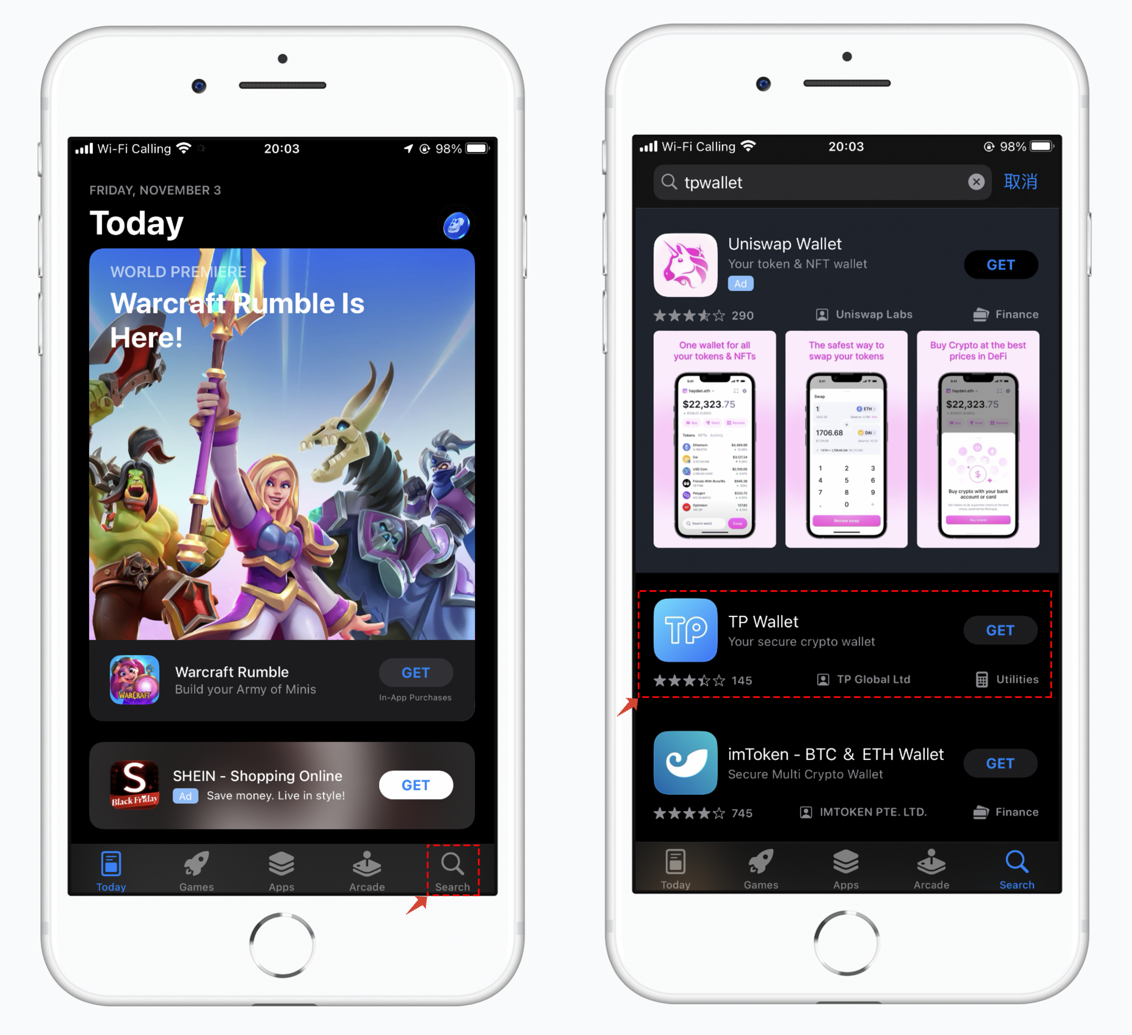 1.Open the App Store and tap on the "Search" function in the bottom right corner. Enter the search keyword "TP Wallet" and search for the results. In the search results, select the TP Wallet with the blue icon. Below the app interface, you will see the developer listed as "TP Global Ltd." Make sure to identify the developer as this is the only official TokenPocket identifier.
