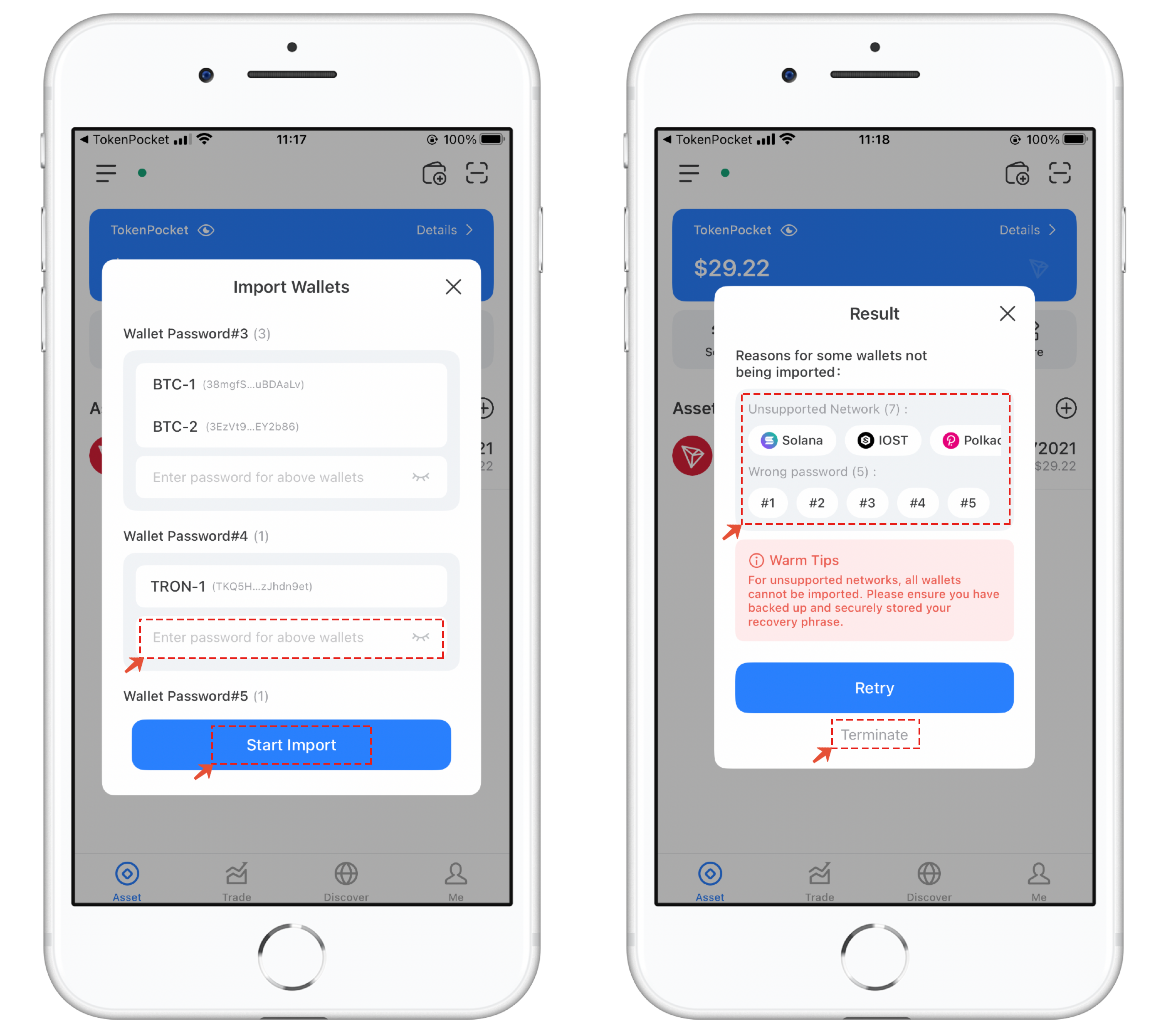 3. Pay attention to the prompt messages on the wallet import interface. Since the addresses in the old version of TokenPocket can have independently set passwords, you need to enter the correct password for the address you want to import. The import result will display messages such as unimported blockchains and password errors. After confirming that TP Wallet supports the wallet import, click \[Finish Import].