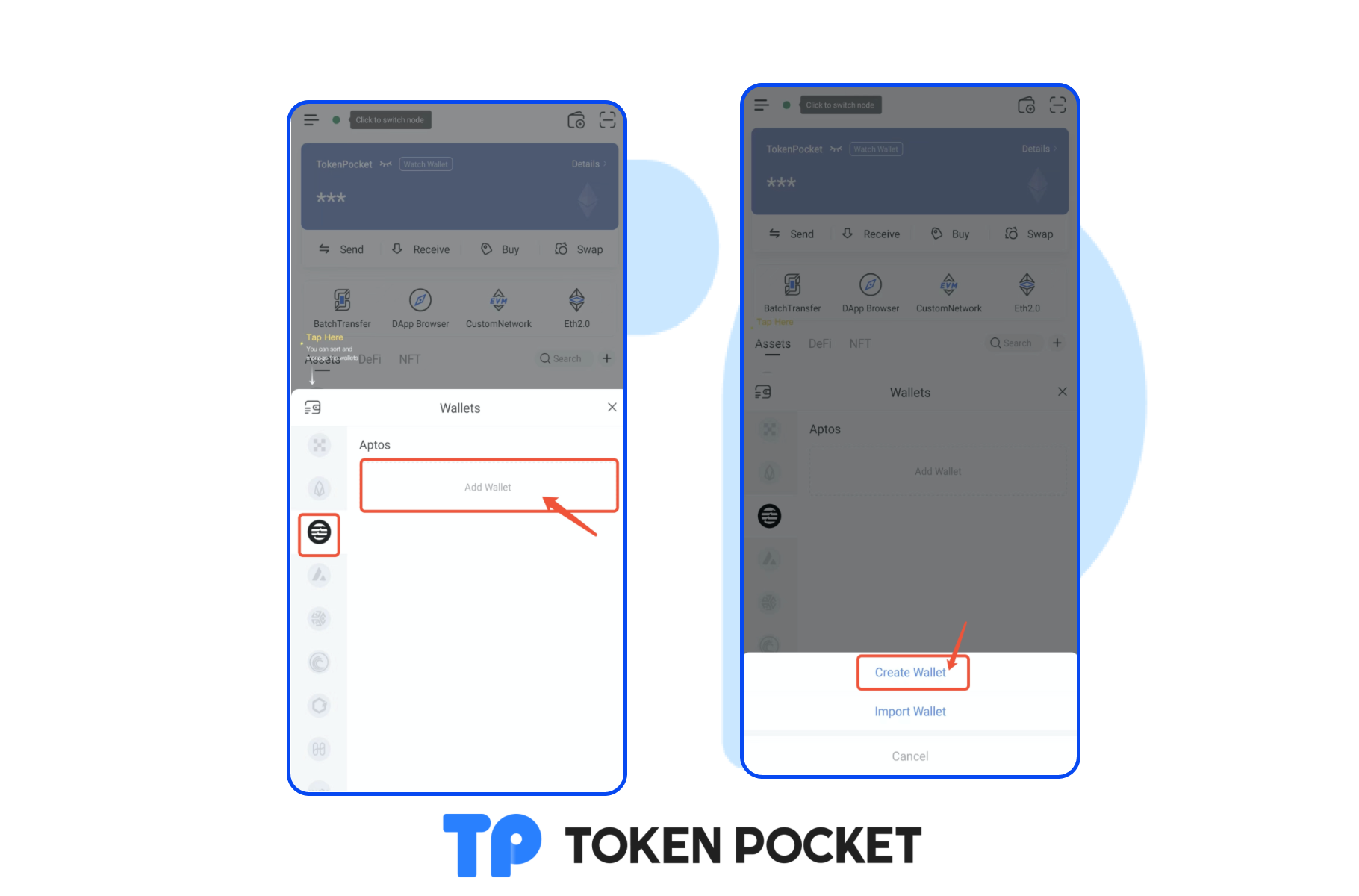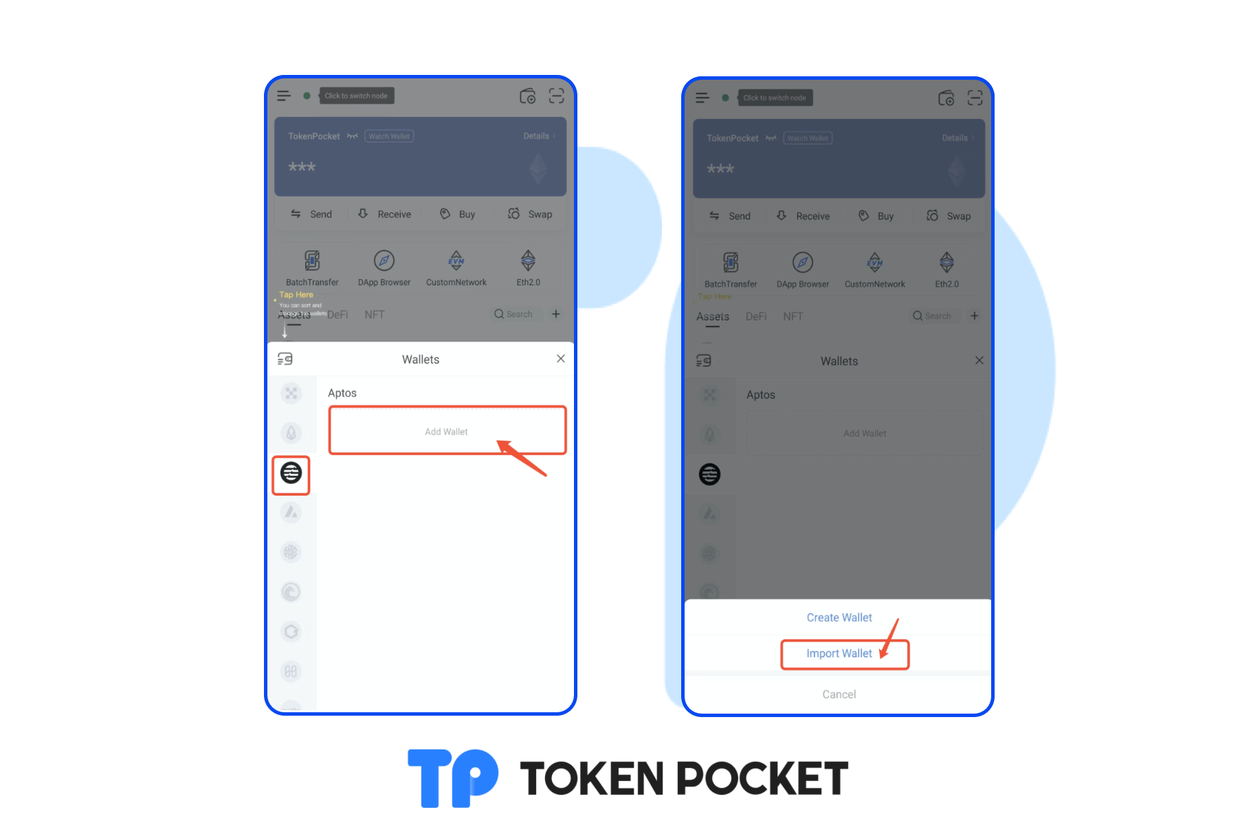 Open TokenPocket APP, click the pattern on the upper left corner and switch the wallet network, select Aptos, click [Add Wallet] and click [Import Wallet]; you can import your wallet by entering private key or secret recovery phrase.