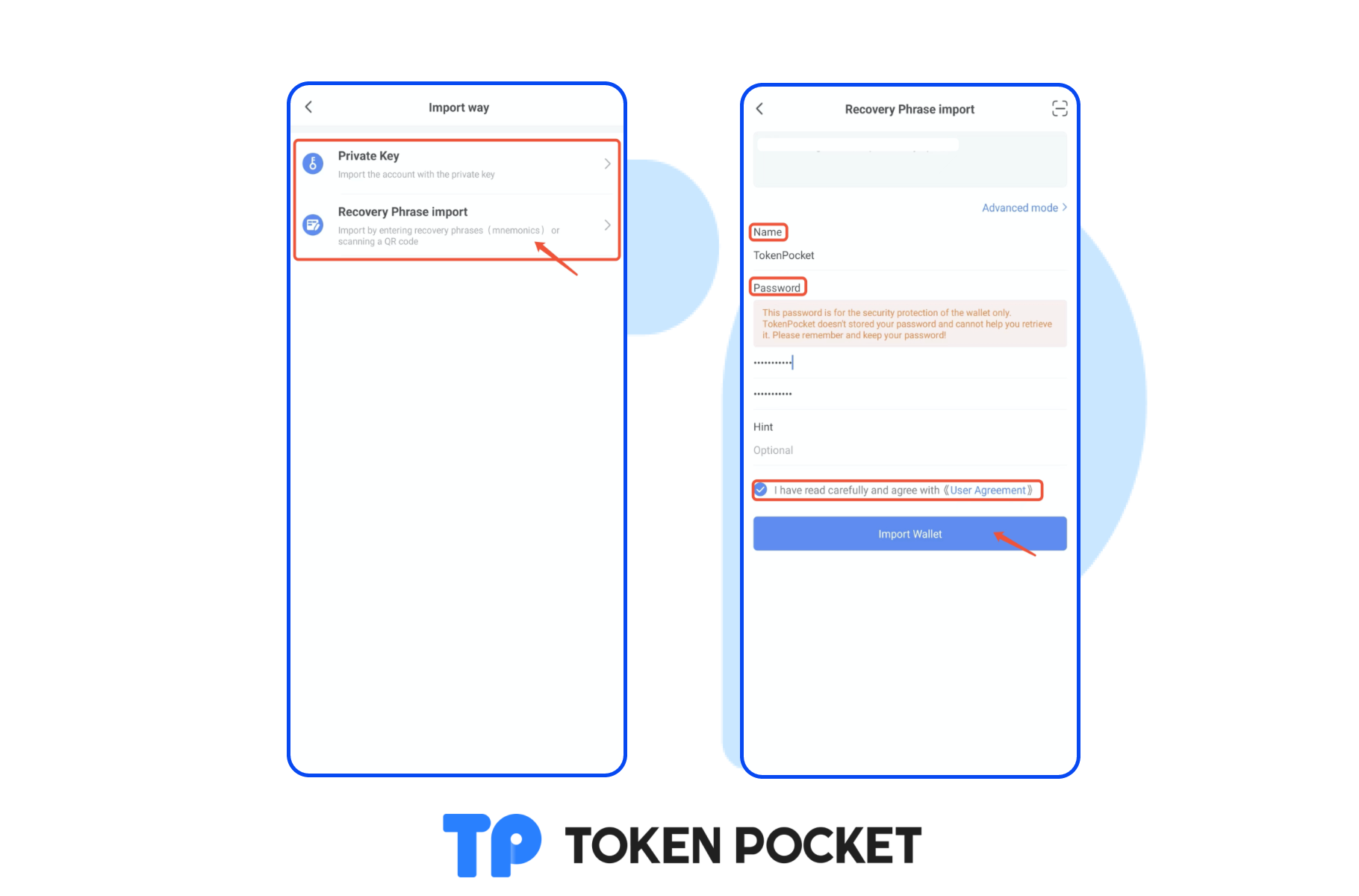 2. Take [Recovery Phrase import] as an example, enter your secret recovery phrase, wallet name, and password, click the User Agreement, and click [Import Wallet].