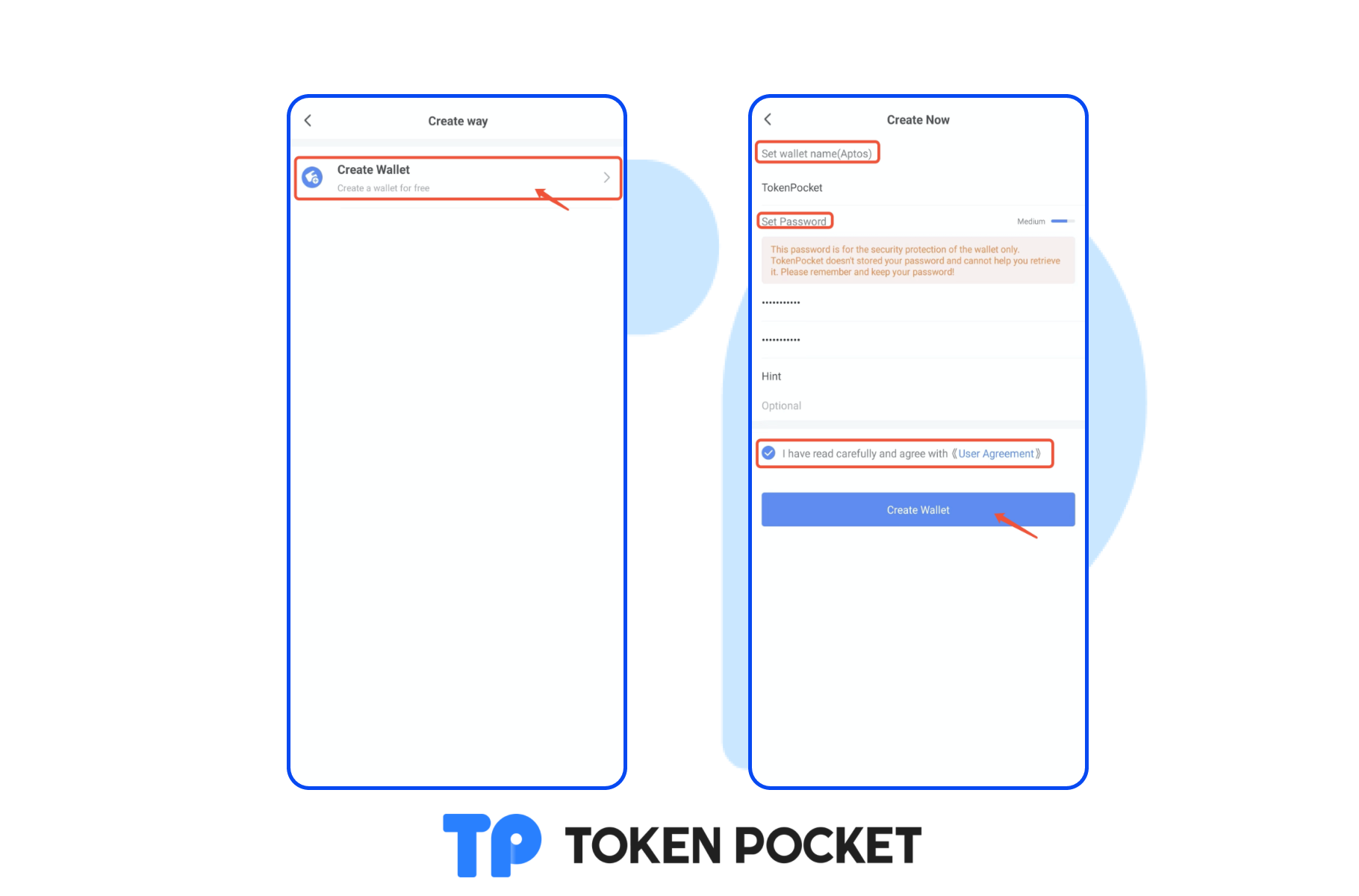 2. Click [Create Wallet] again and set the wallet name and password, click the User Agreement, and click [Create Wallet];