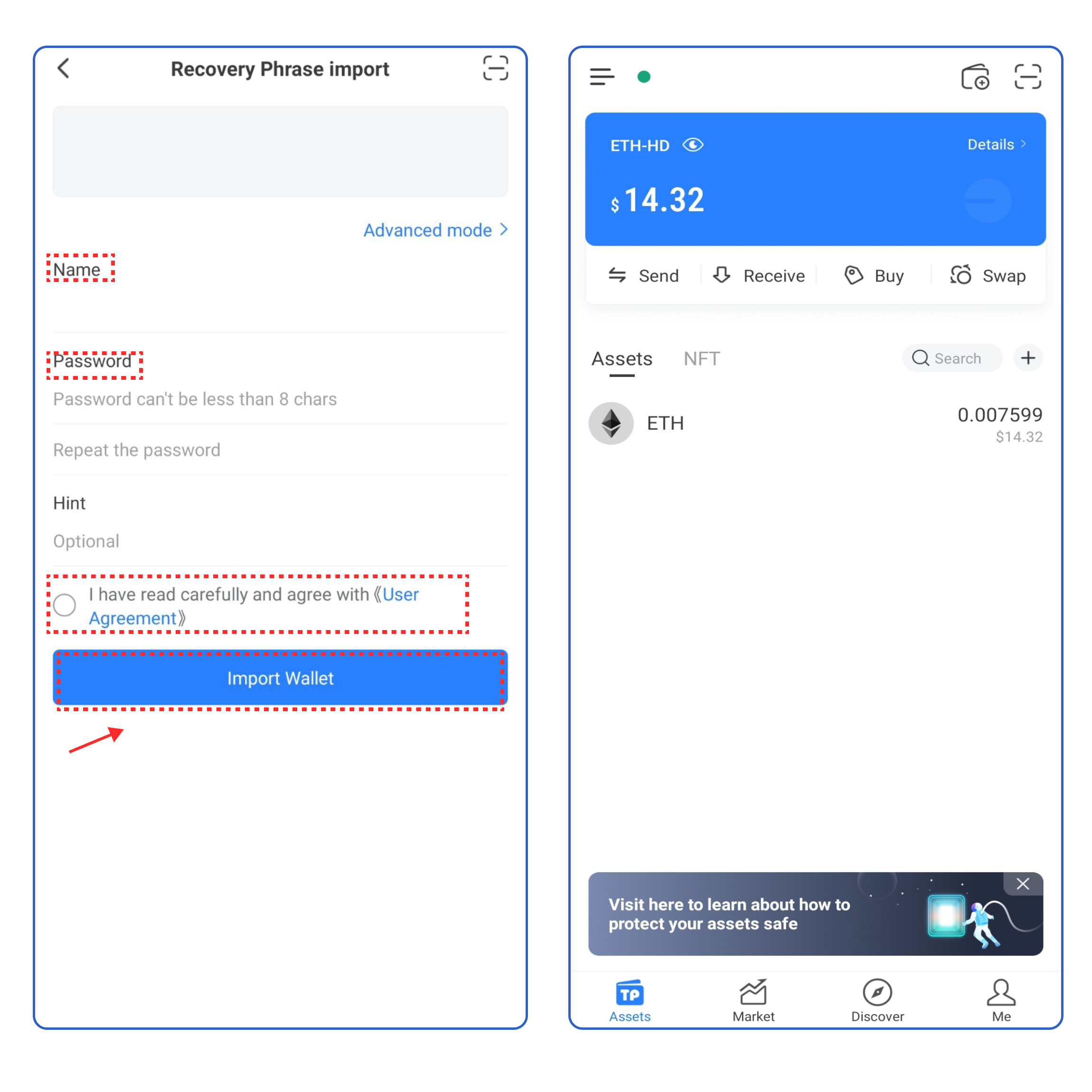 3. Take [Recovery Phrase import] as an example, enter your secret recovery phrase, wallet name, and password, click the User Agreement, and click [Import Wallet]. At this point, you have successfully imported a Base wallet.