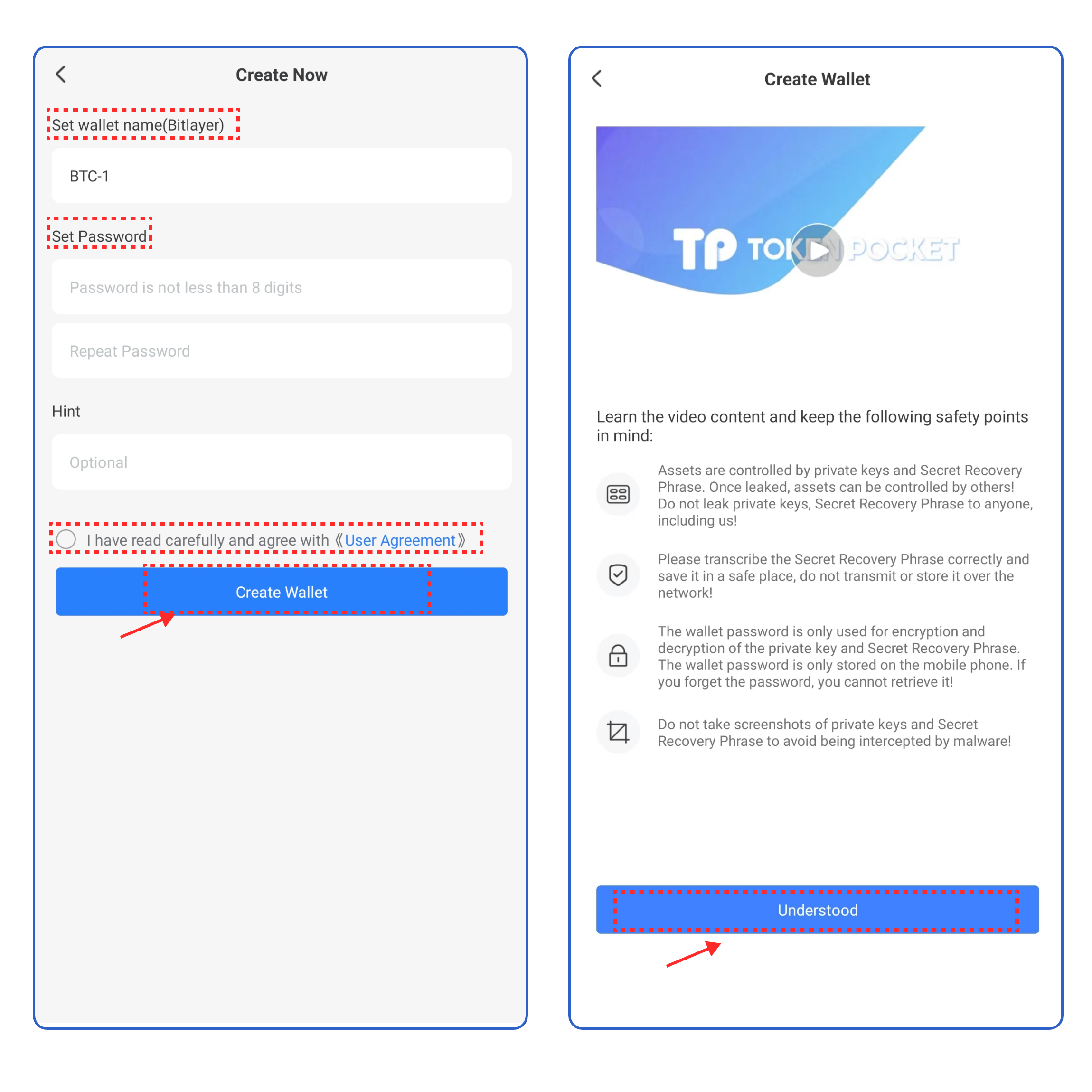 3. Set the wallet name and password, click the User Agreement, and click [Create Wallet]. Watch and learn the video content, click [Understood].