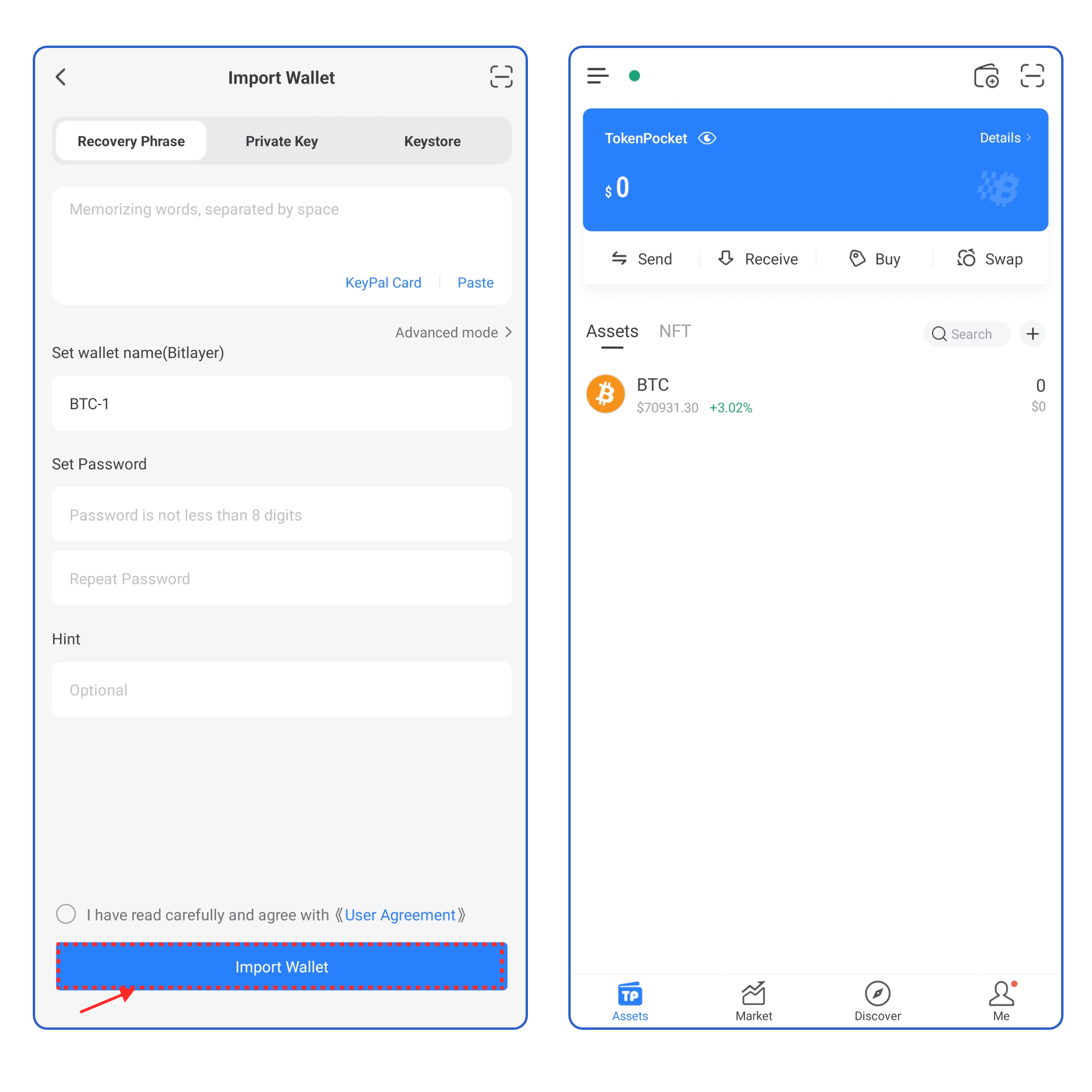 3. Take [Recovery Phrase import] as an example, enter your secret recovery phrase, wallet name, and password, click the User Agreement, and click [Import Wallet]. At this point, you have successfully imported a Bitlayer wallet.