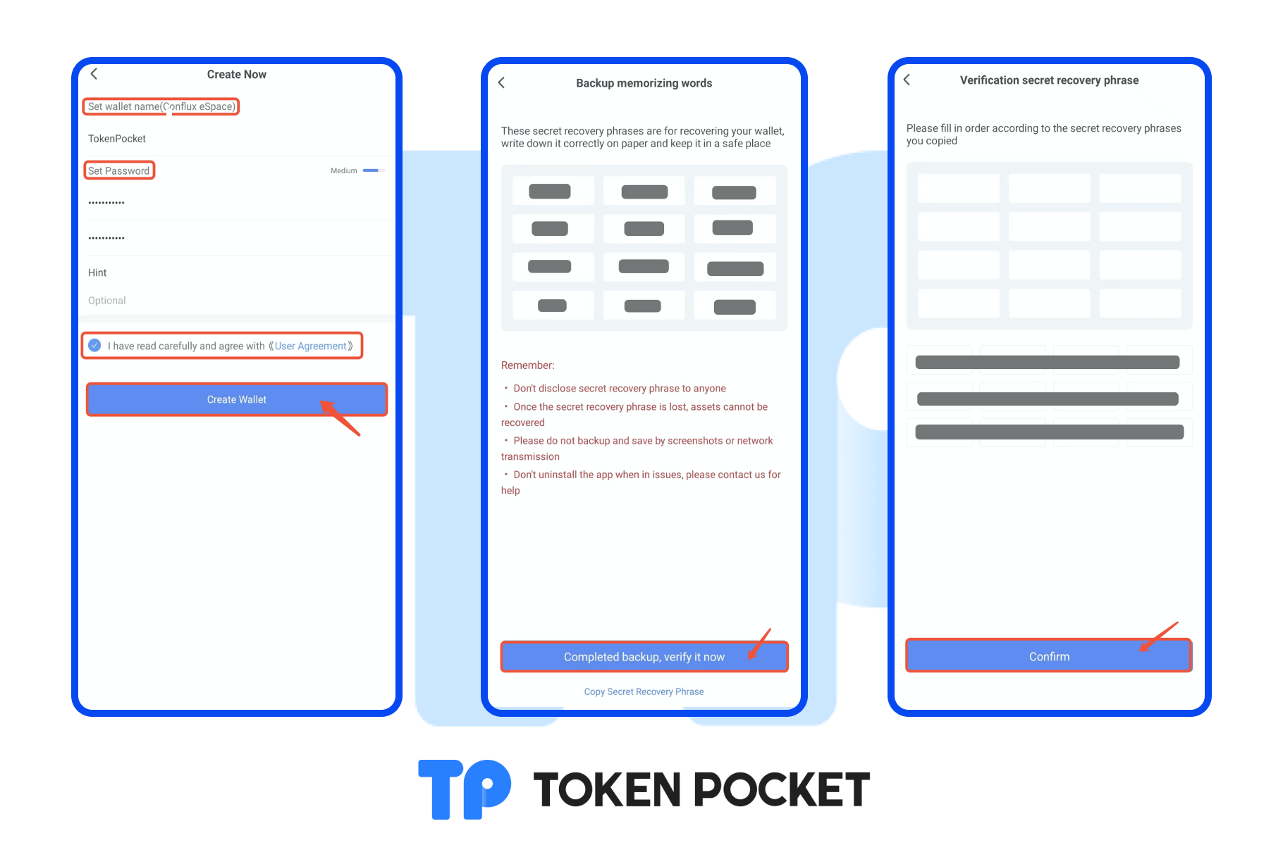 2. Set the wallet name and password, click the User Agreement, click [Create Wallet]; Back up the secret recovery phrase on the paper, and store it in a safe place. Click [Completed backup, verify now]. Enter your secret recovery phrase, and click [Confirm].