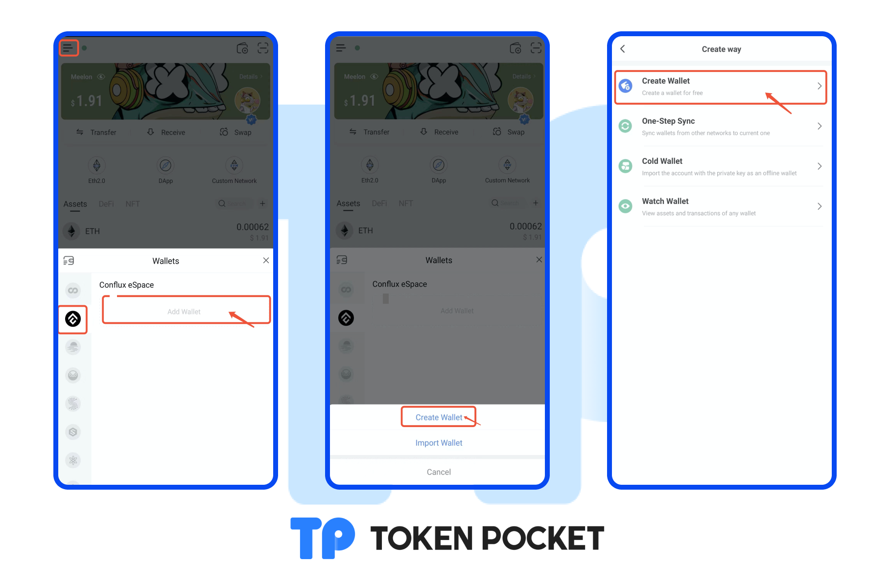 1. Open TokenPocket APP, click the pattern on the upper left corner and switch the wallet network, select Conflux eSpace, click [Add Wallet] and click [Create Wallet]; click [Create Wallet] again.
