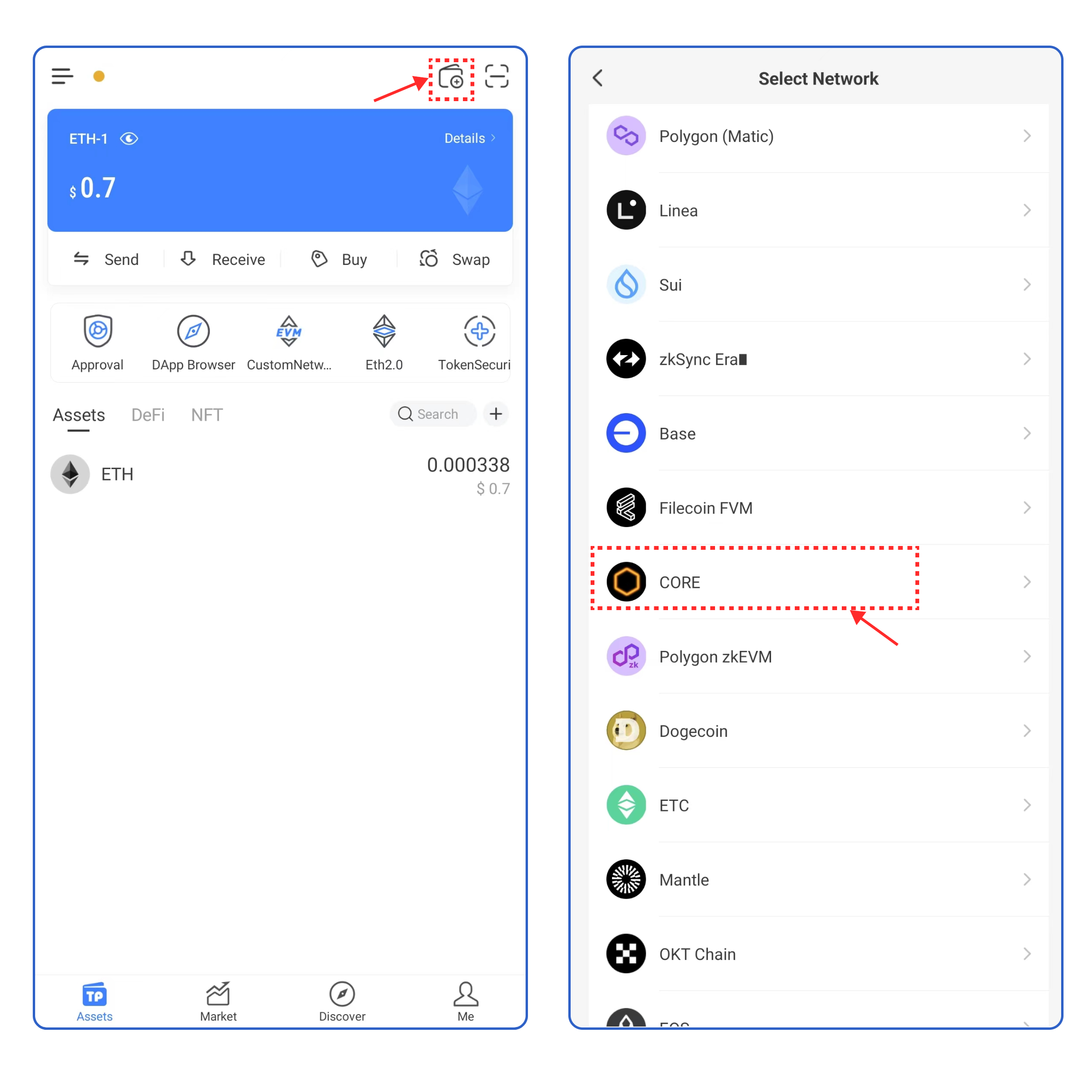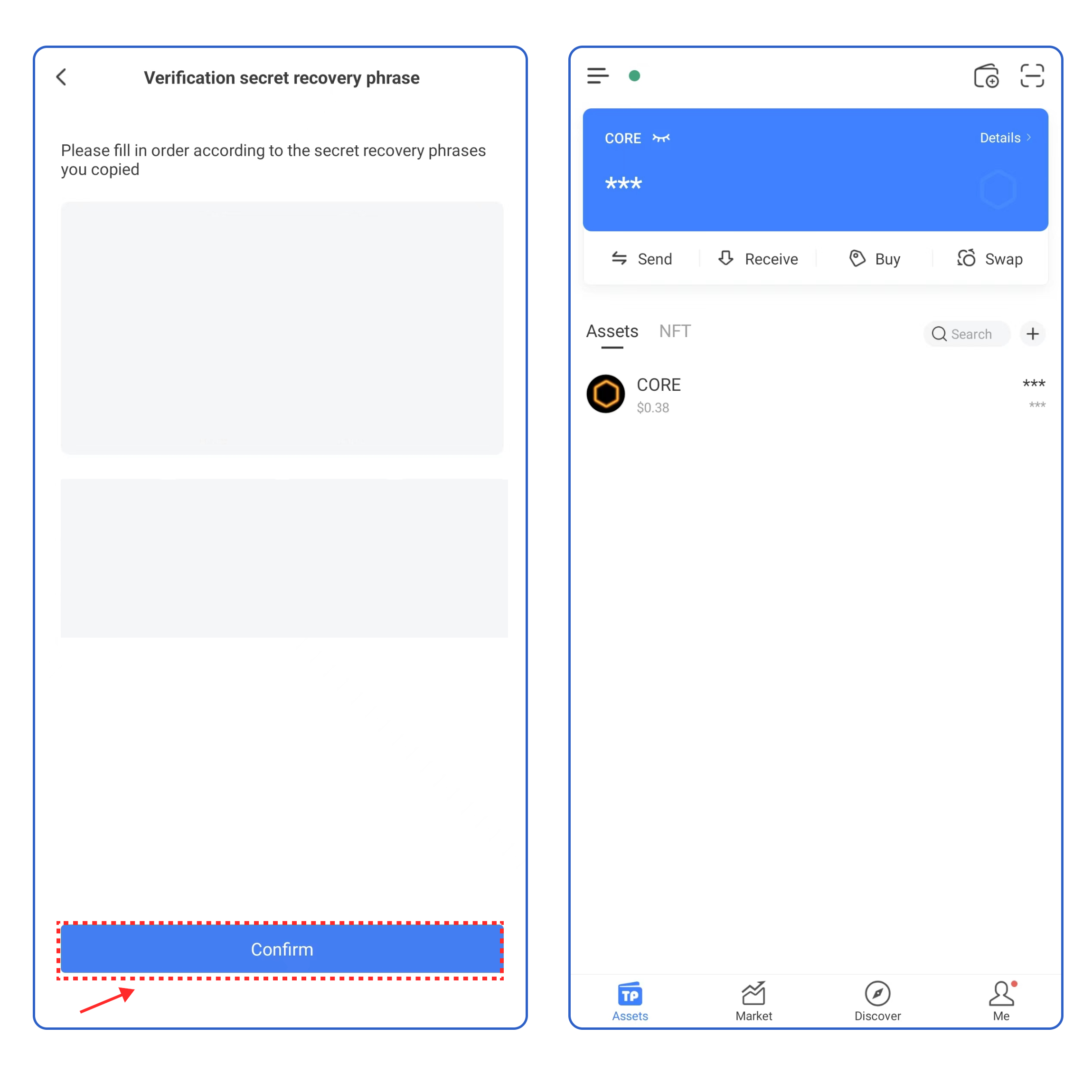 5. Enter your secret recovery phrase, and click [Confirm]. At this point, you have successfully created a Core wallet.