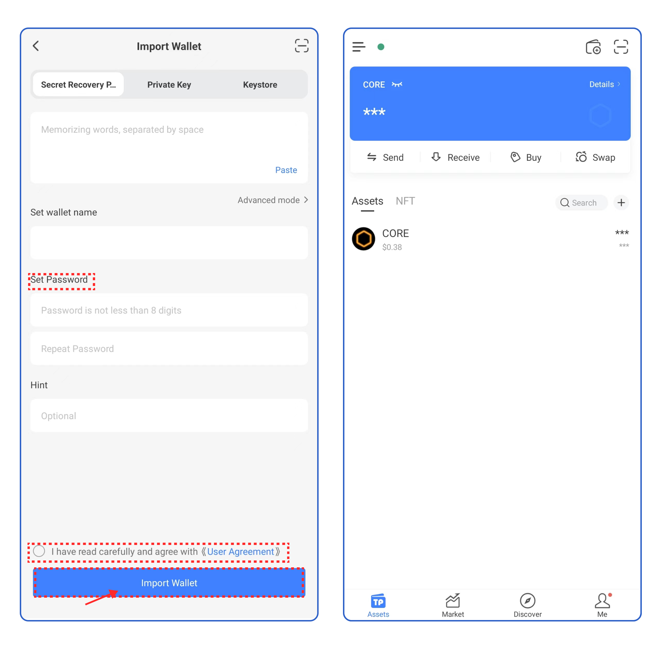 3. Take [Recovery Phrase import] as an example, enter your secret recovery phrase, wallet name, and password, click the User Agreement, and click [Import Wallet]. At this point, you have successfully imported a Core wallet.