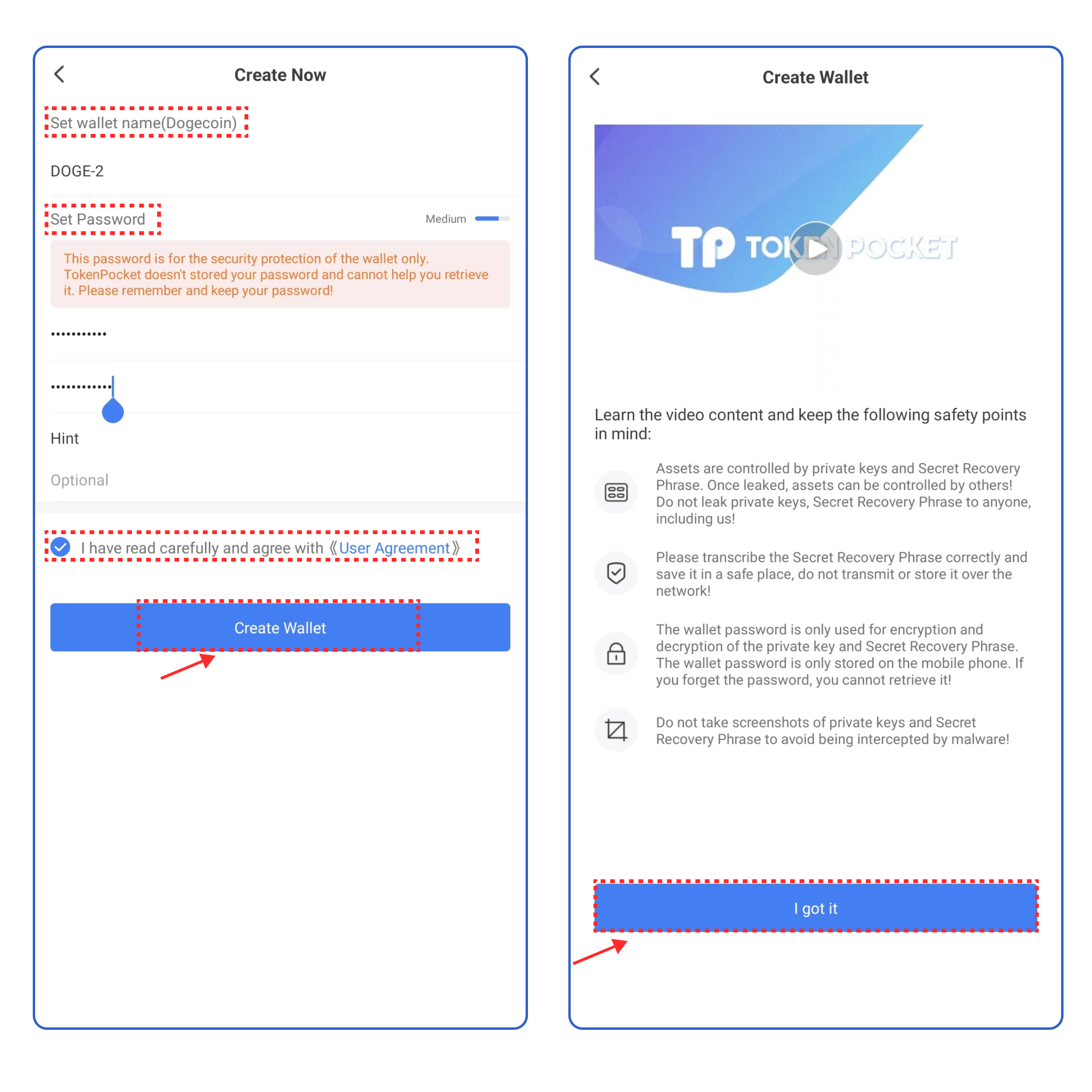 3. Set the wallet name and password, click the User Agreement, and click [Create Wallet]. Watch and learn the video content, click [I got it].