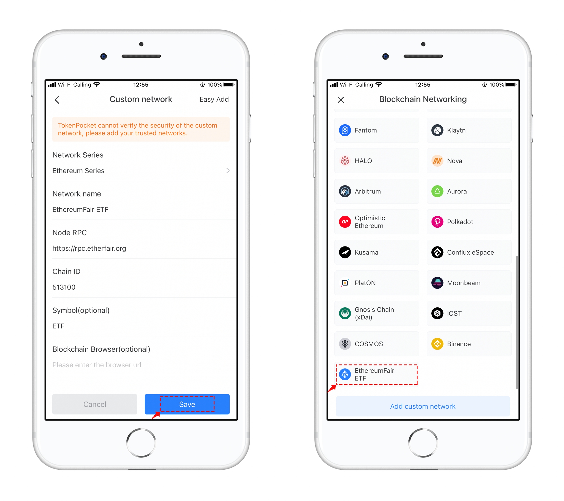 3、Double check the information and click “Save” in the lower right corner to add it successfully. Go back to the “Select Network” interface and pull down to the bottom to see the newly added EthereumFair network.