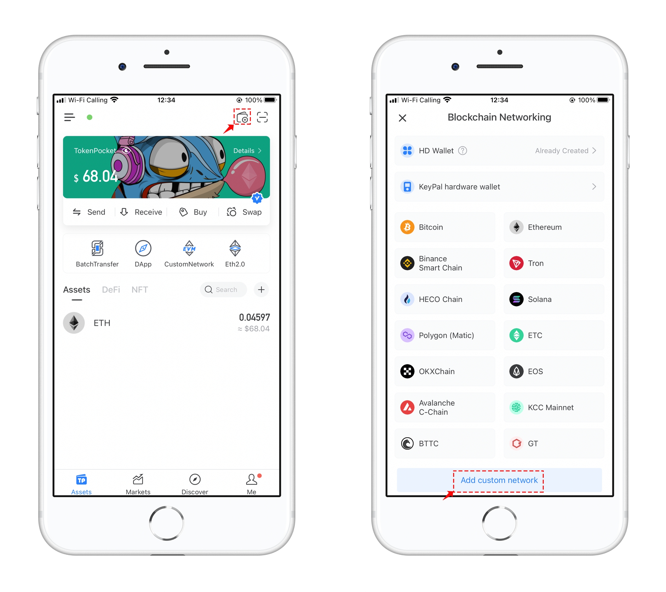 1、Open TokenPocket, click the wallet icon in the upper right corner, and tab “Add Custom Network” at the bottom of the “Select Network” page.