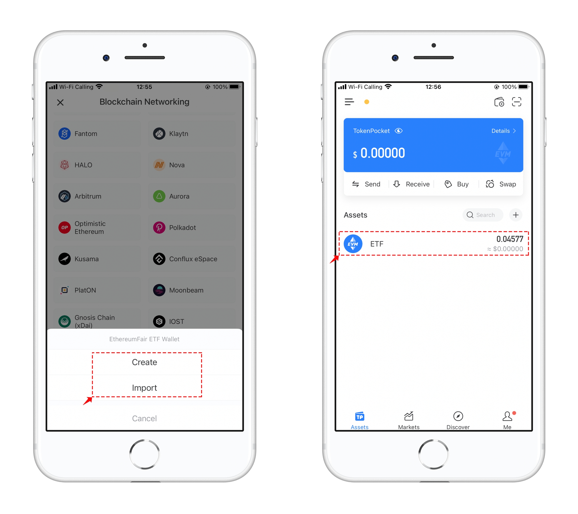 4、Click on the newly added chain, and you can choose “Create” or “Import” to use the ETF wallet. Import your wallet and you can see the ETF airdrop you received.