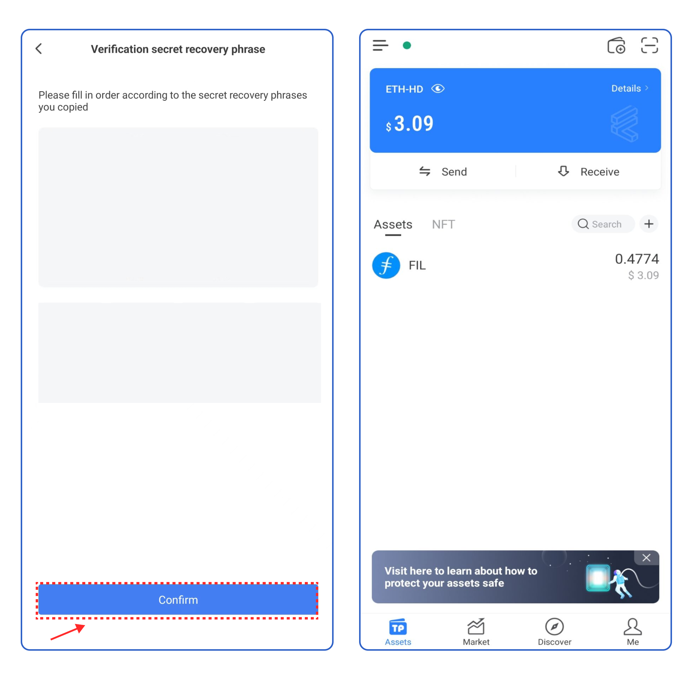 5. Enter your secret recovery phrase, and click [Confirm]. At this point, you have successfully created a Filecoin FVM wallet.