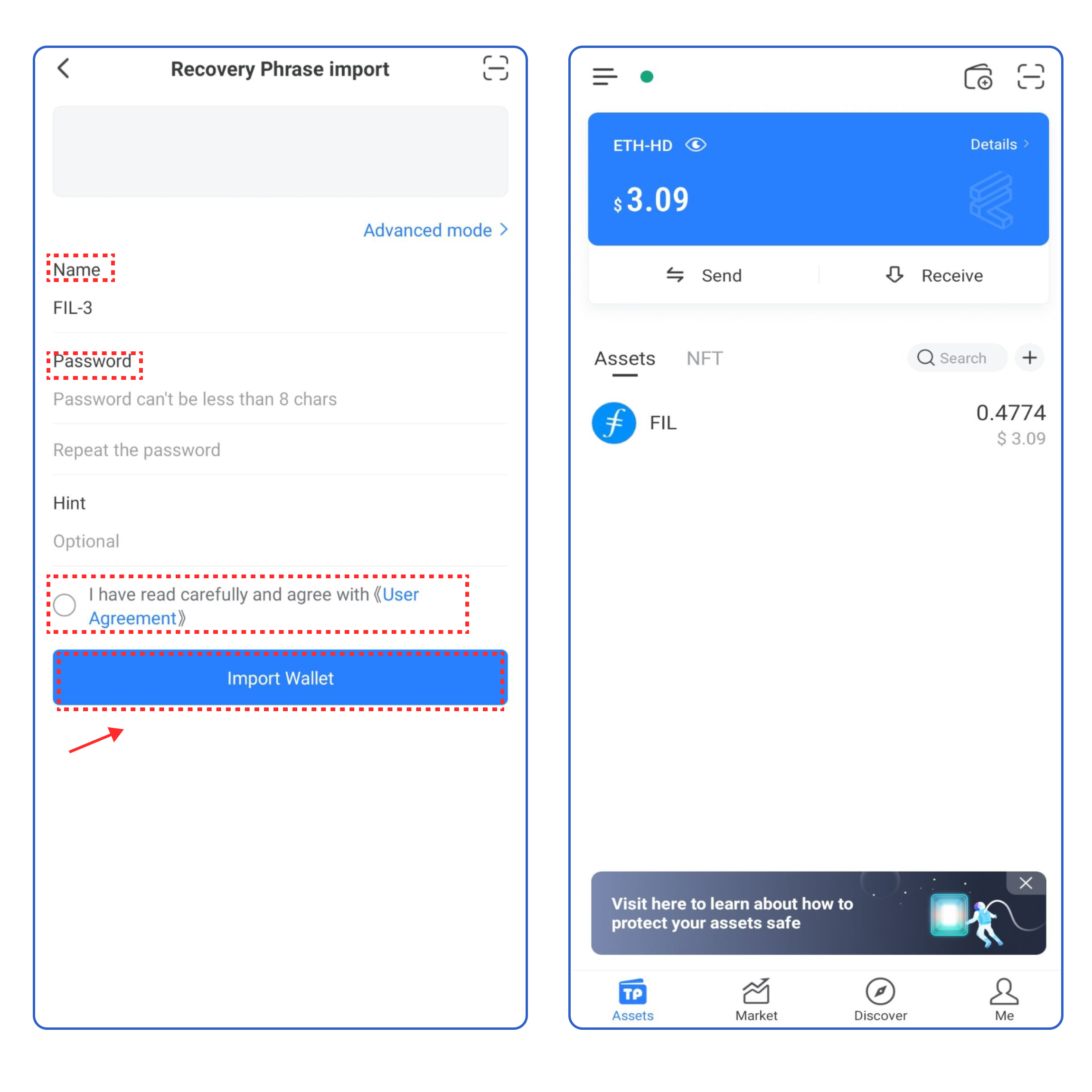 3. Take [Recovery Phrase import] as an example, enter your secret recovery phrase, wallet name, and password, click the User Agreement, and click [Import Wallet]. At this point, you have successfully imported a Filecoin FVM wallet.