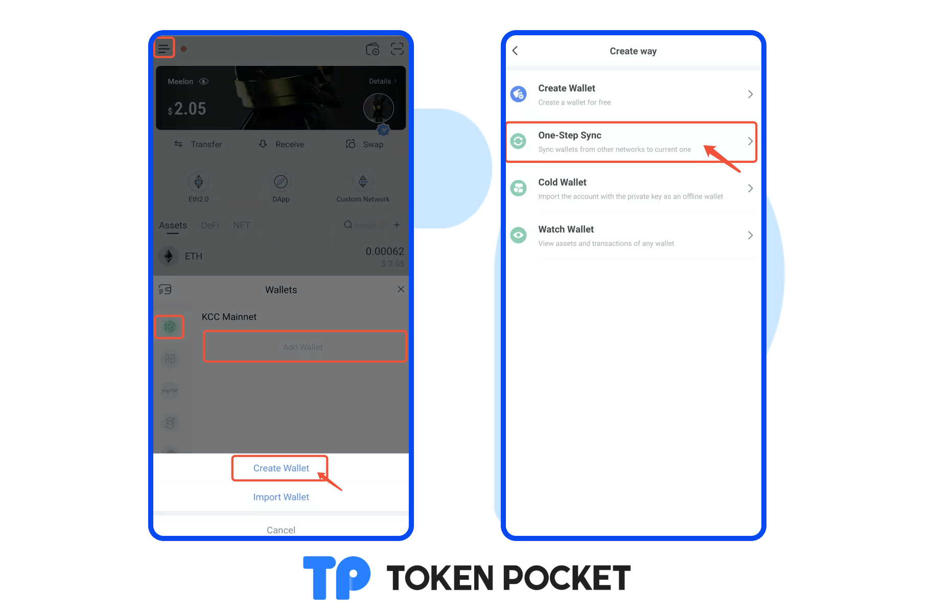 1. Open the TokenPocket App, click the upper left corner to switch the wallet, then select KCC Mainnet, and click [Add Wallet]; click [Create Wallet], and continue to click [One-Step Sync].