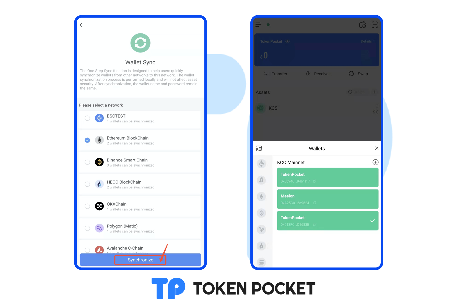 2. Choose the wallet you want to sync and then click [Synchronize]; at this point, the KCC wallet network has been synchronized, and you can select KCC to view it on the asset page.