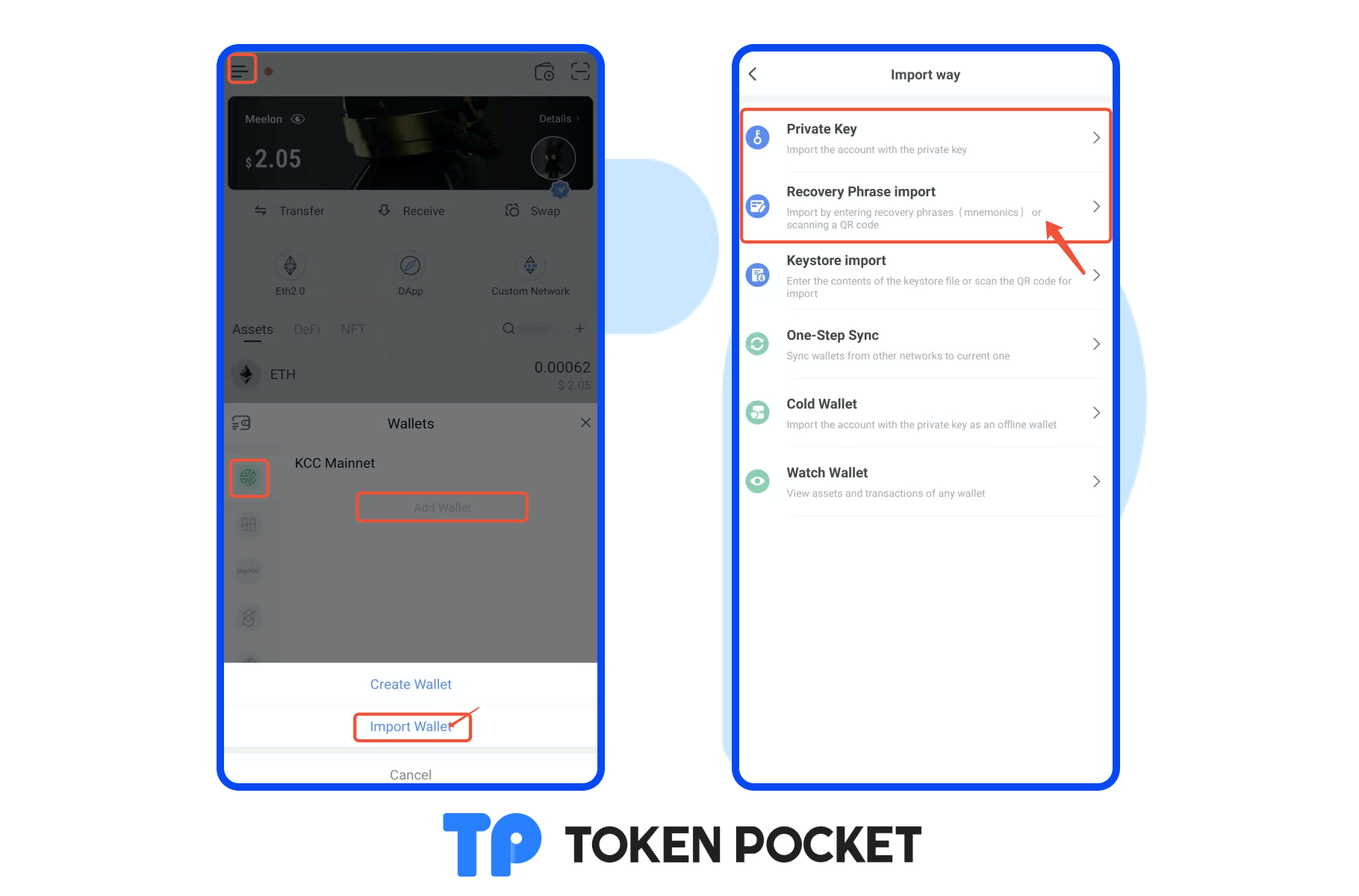 1. Open TokenPocket APP, click the pattern on the upper left corner and switch the wallet network, select KCC Mainnet, click [Add Wallet] and click [Import Wallet]; you can import your wallet by entering private key or secret recovery phrase.