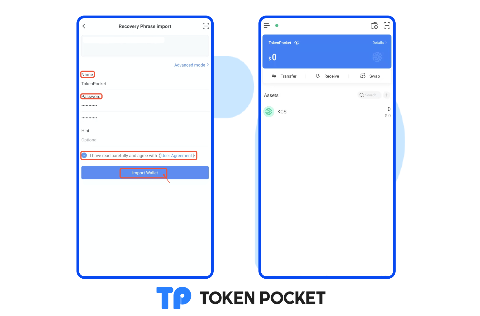2. Take [Recovery Phrase import] as an example, enter your secret recovery phrase, wallet name, and password, click the User Agreement, and click [Import Wallet]. At this point, you have successfully imported a KCC wallet.