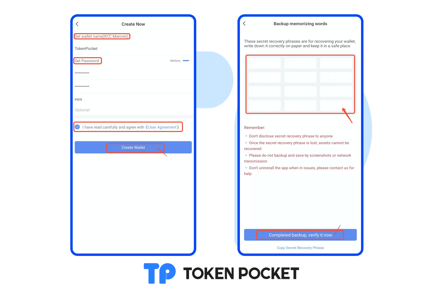 2. Set the wallet name and password, click the User Agreement, click [Create Wallet]; Back up the secret recovery phrase on the paper, and store it in a safe place. Click [Completed backup, verify now].
