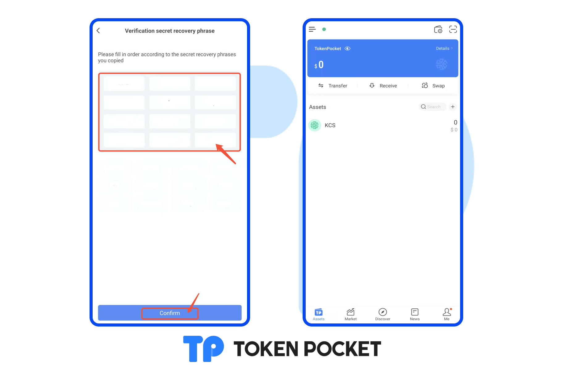 3. Enter your secret recovery phrase, and click [Confirm]. At this point, you have successfully created a KCC wallet.