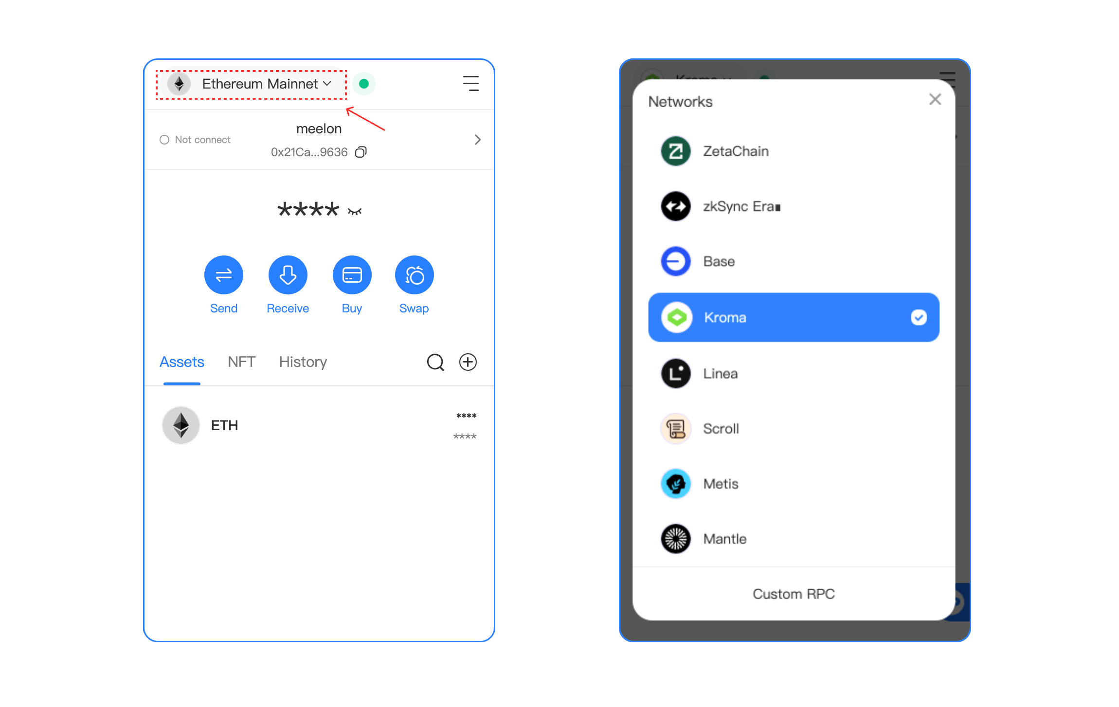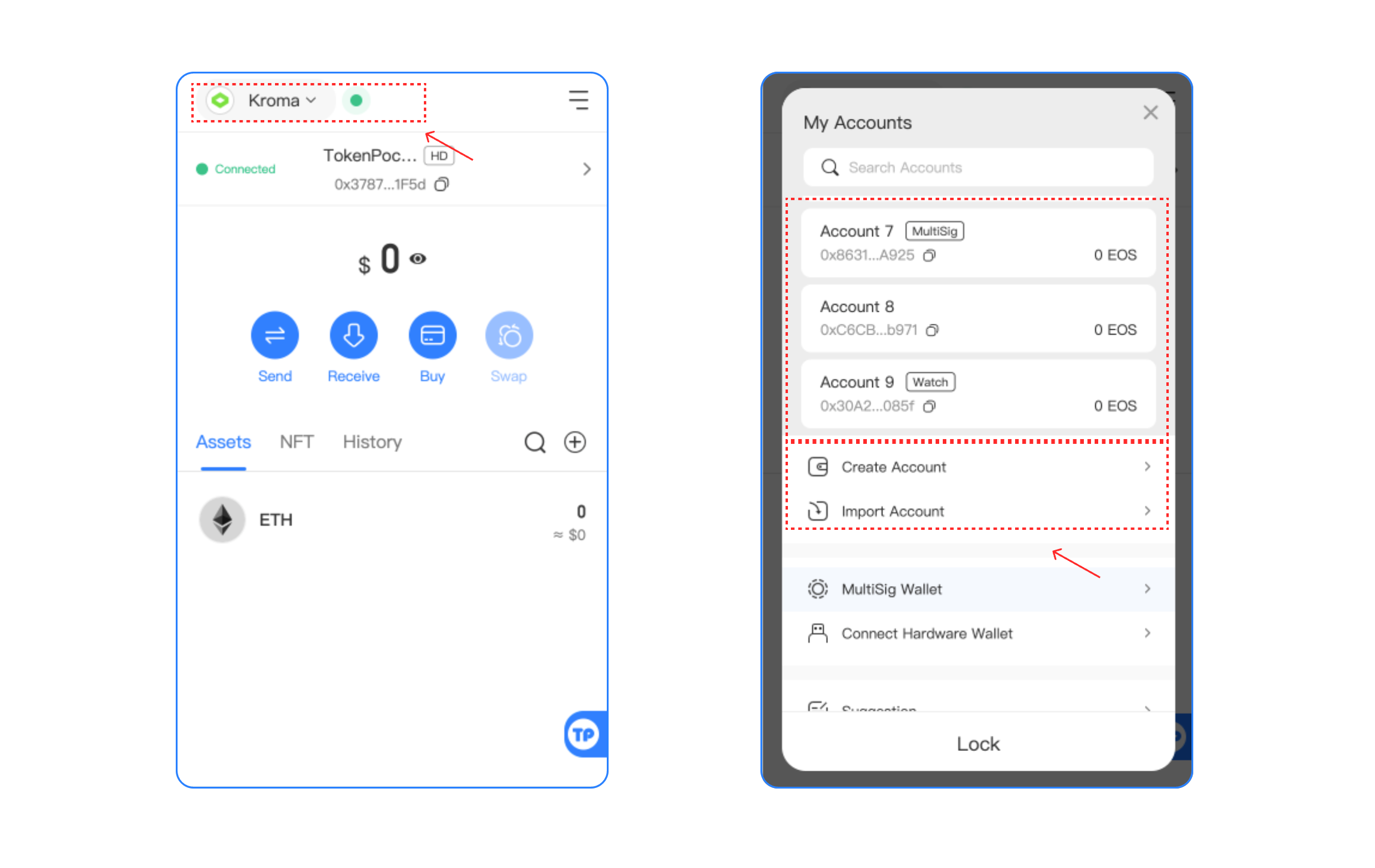 After you select, you can view your Kroma Wallet on the Assets page, click the upper right corner to access the management page, you can switch your wallet, and create/import a wallet on this page.