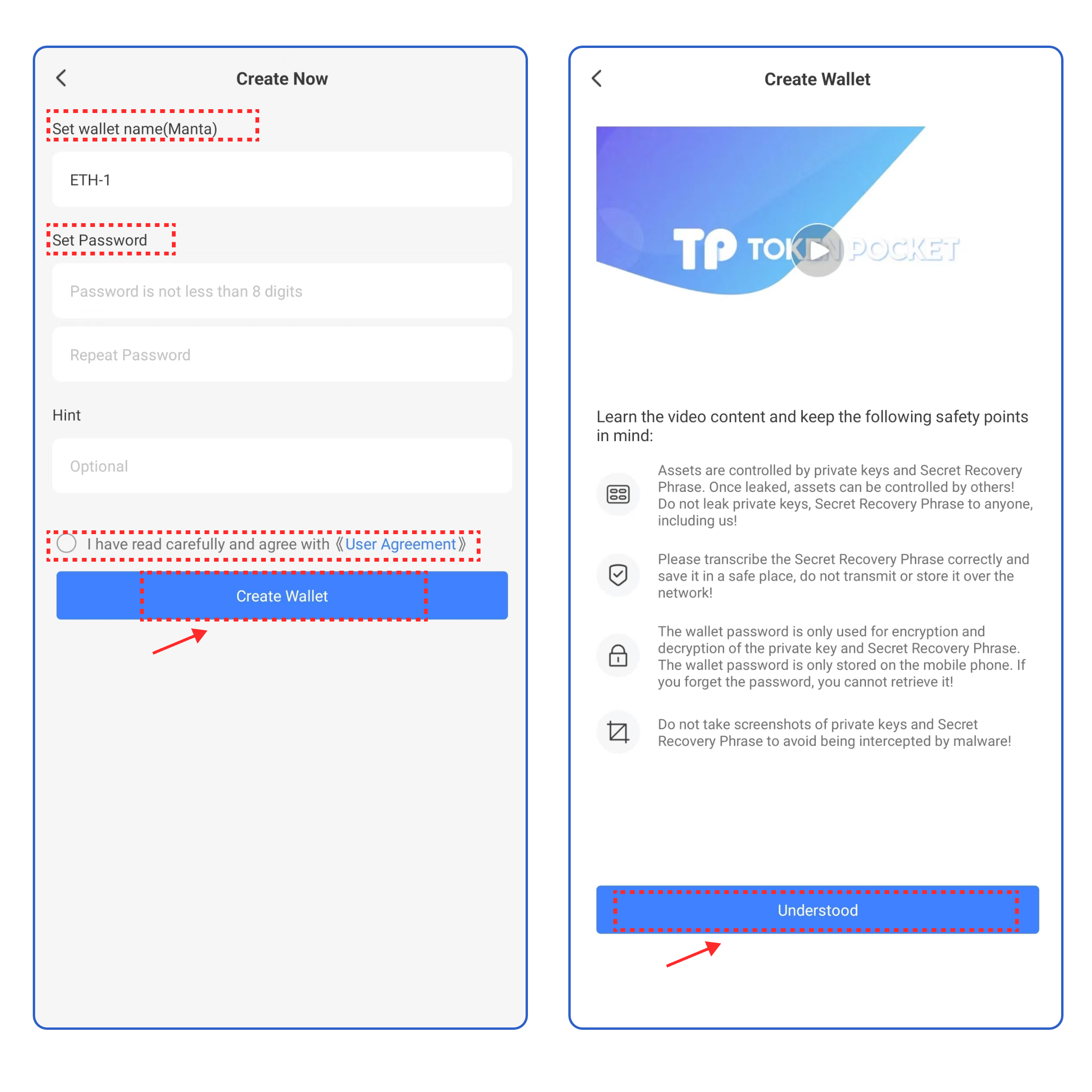 3. Set the wallet name and password, click the User Agreement, and click [Create Wallet]. Watch and learn the video content, click [Understood].