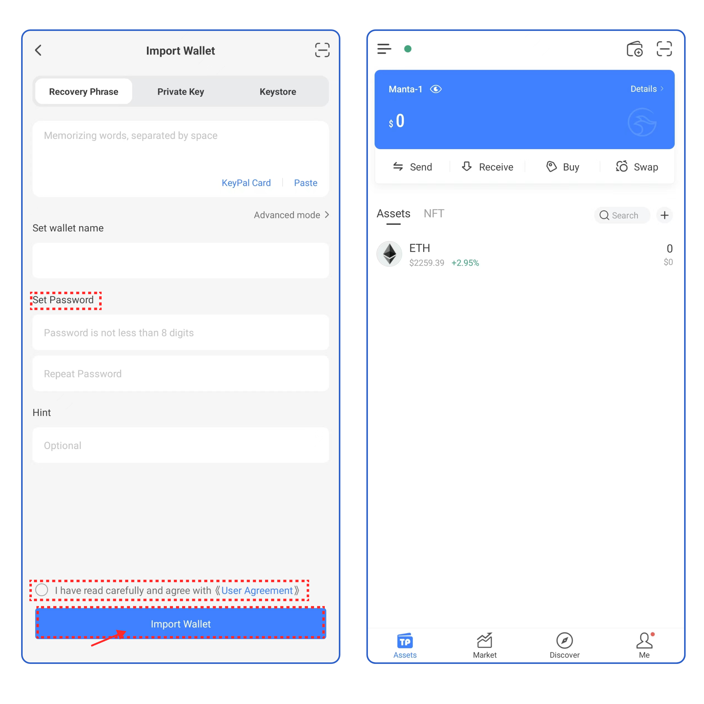 3. Take [Recovery Phrase import] as an example, enter your secret recovery phrase, wallet name, and password, click the User Agreement, and click [Import Wallet]. At this point, you have successfully imported a Manta wallet.