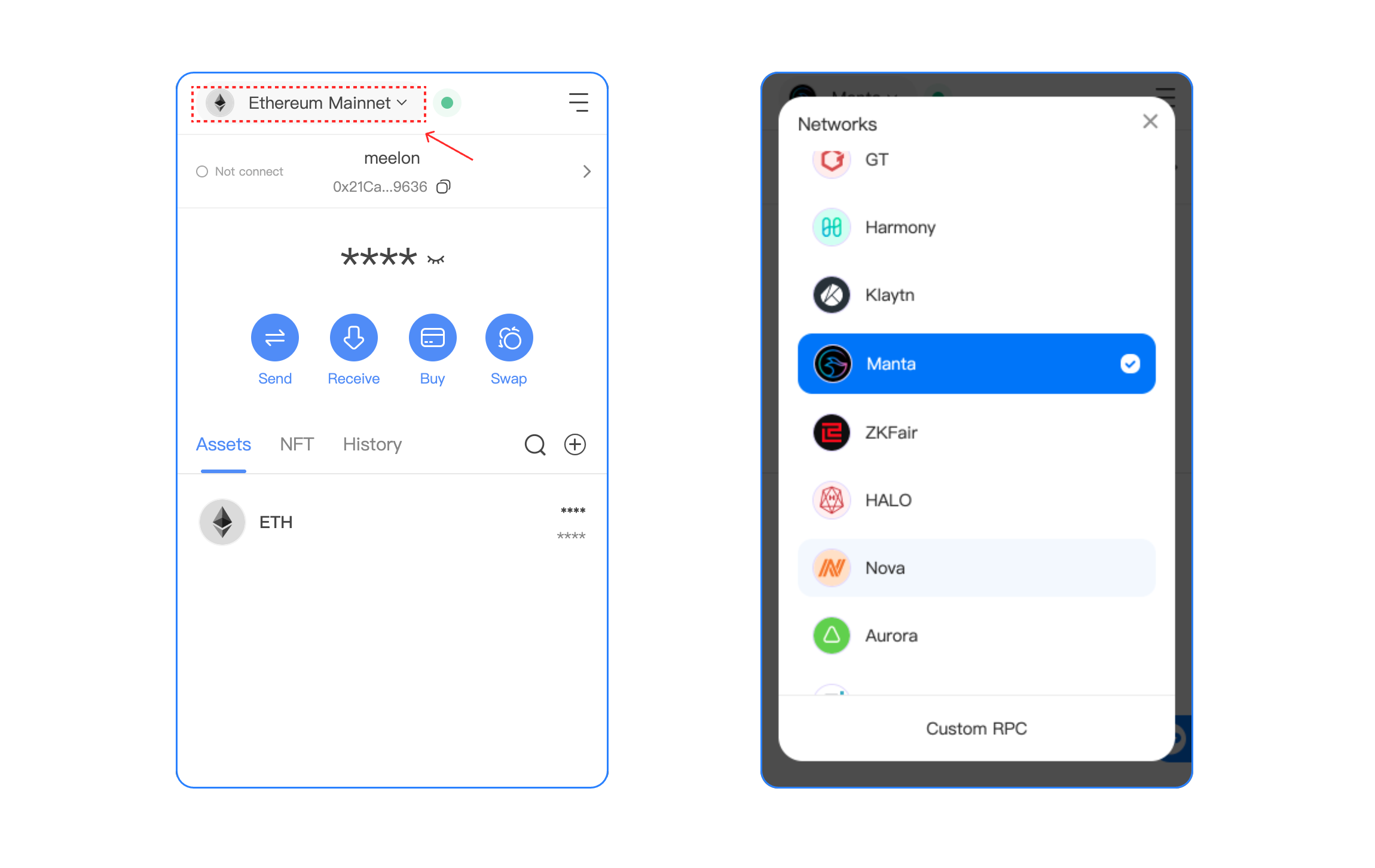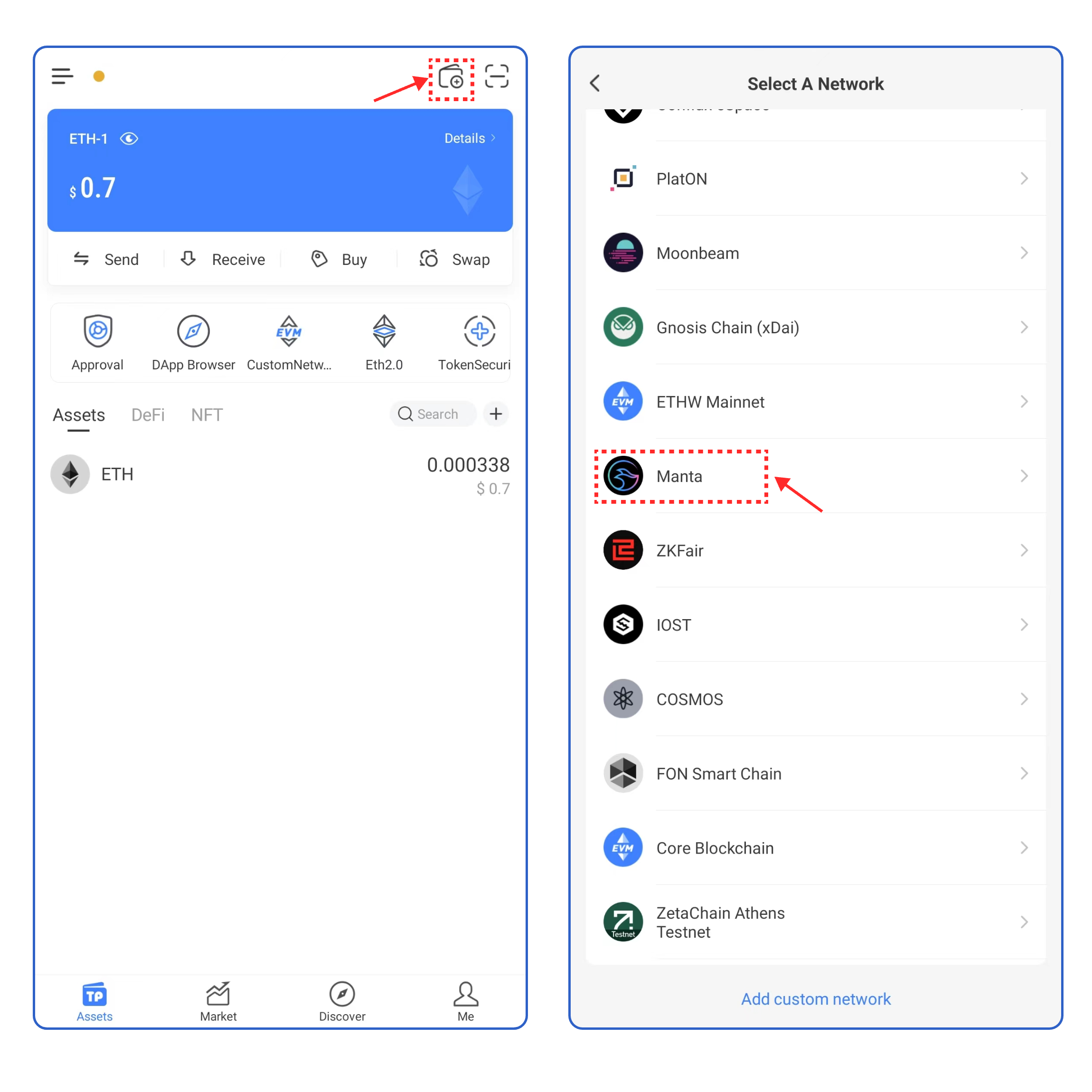 Open TokenPocket Chrome Extension, click the upper left corner to select the Manta Network.