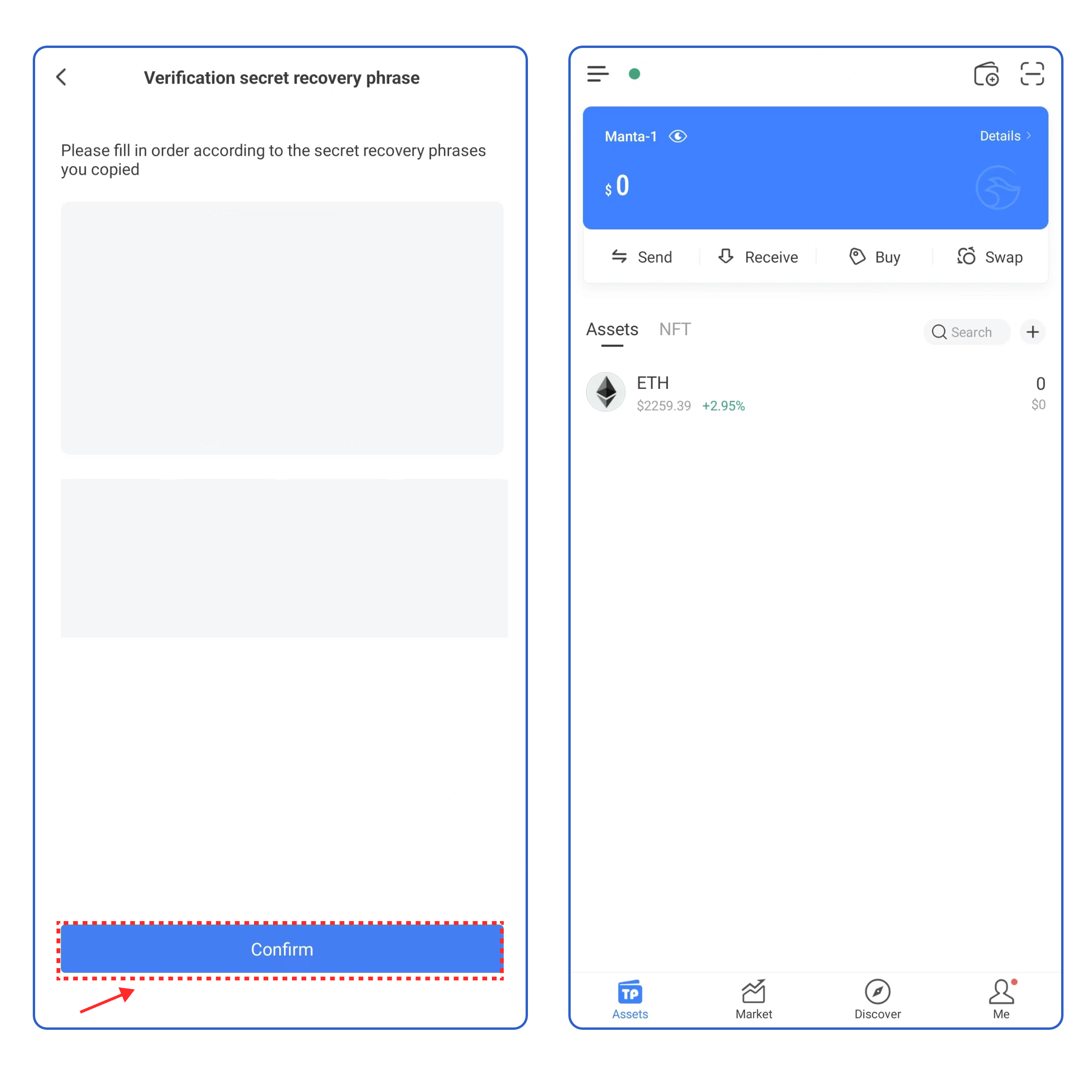 5. Enter your secret recovery phrase, and click [Confirm]. At this point, you have successfully created a Manta wallet.