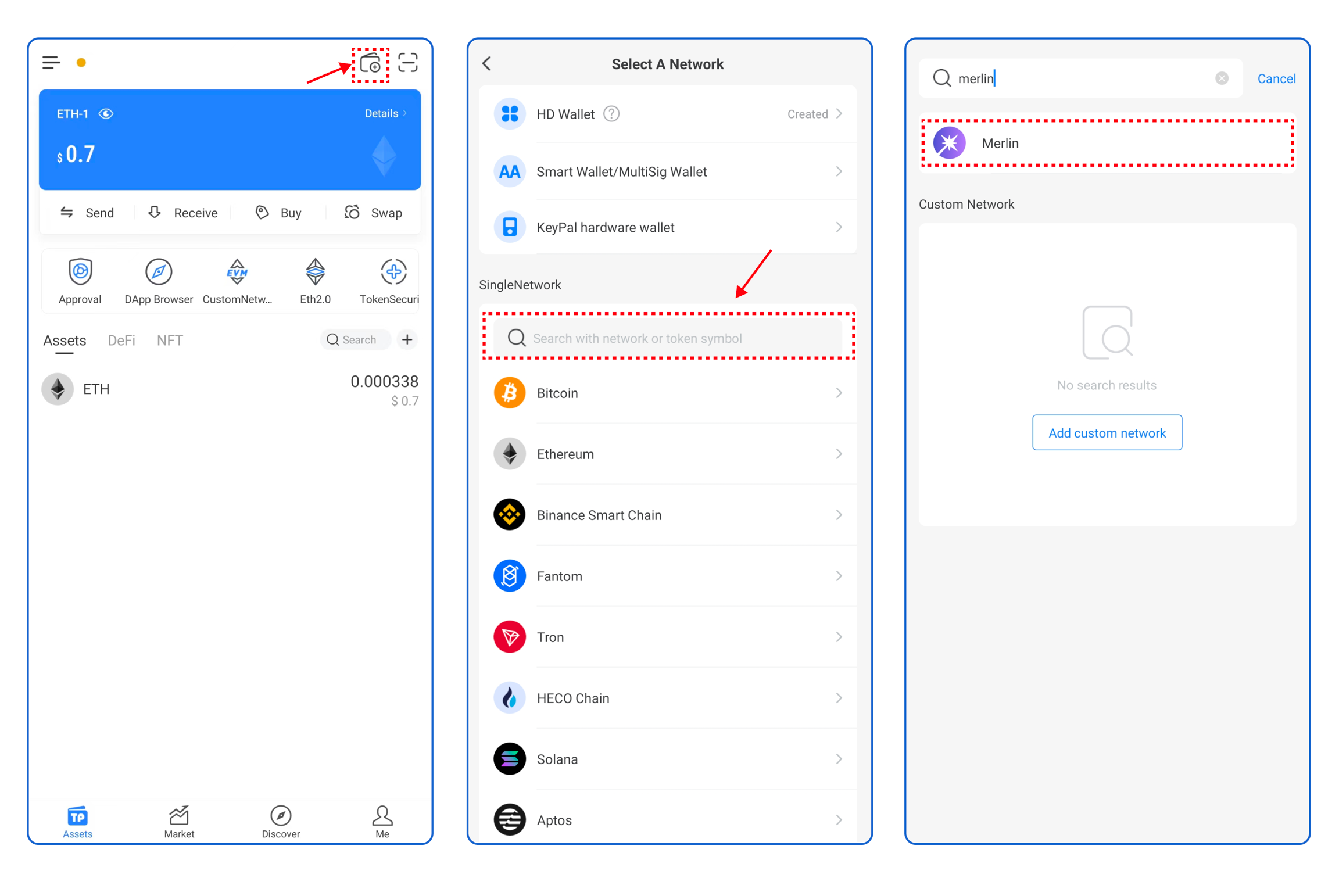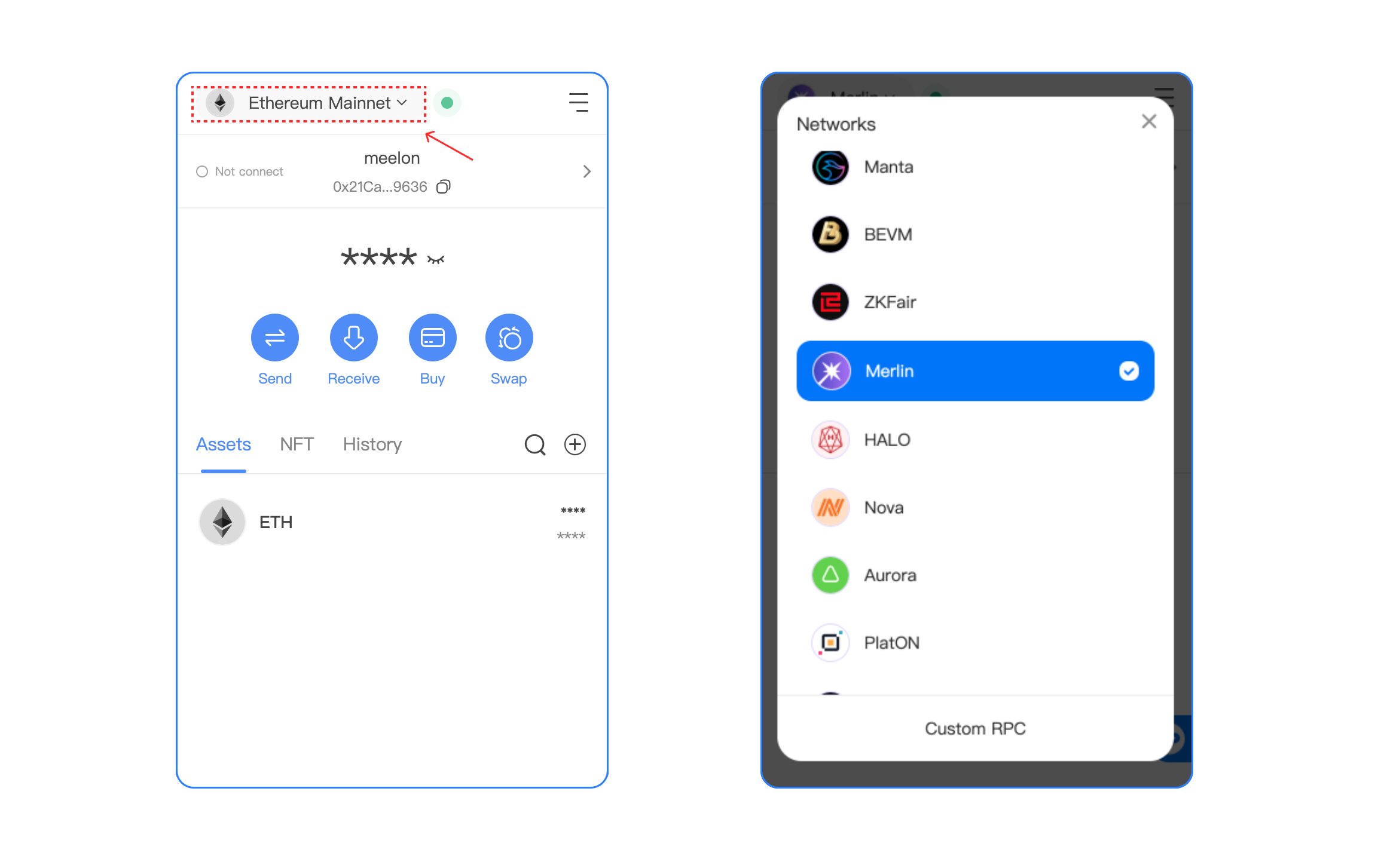 Open TokenPocket Chrome Extension, and click the upper left corner to select the Merlin Network.
