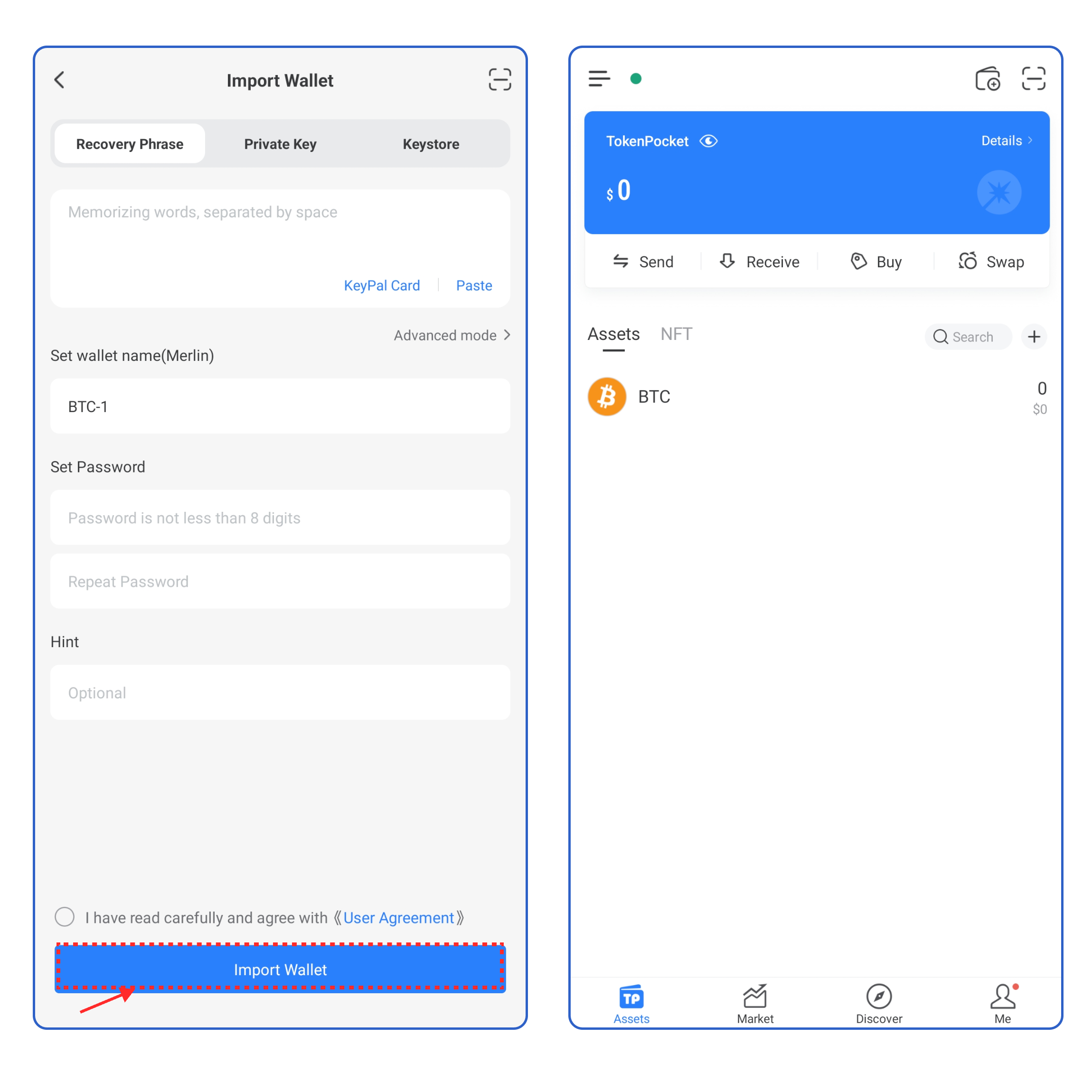 3. Take [Recovery Phrase import] as an example, enter your secret recovery phrase, wallet name, and password, click the User Agreement, and click [Import Wallet]. At this point, you have successfully imported a Merlin wallet.