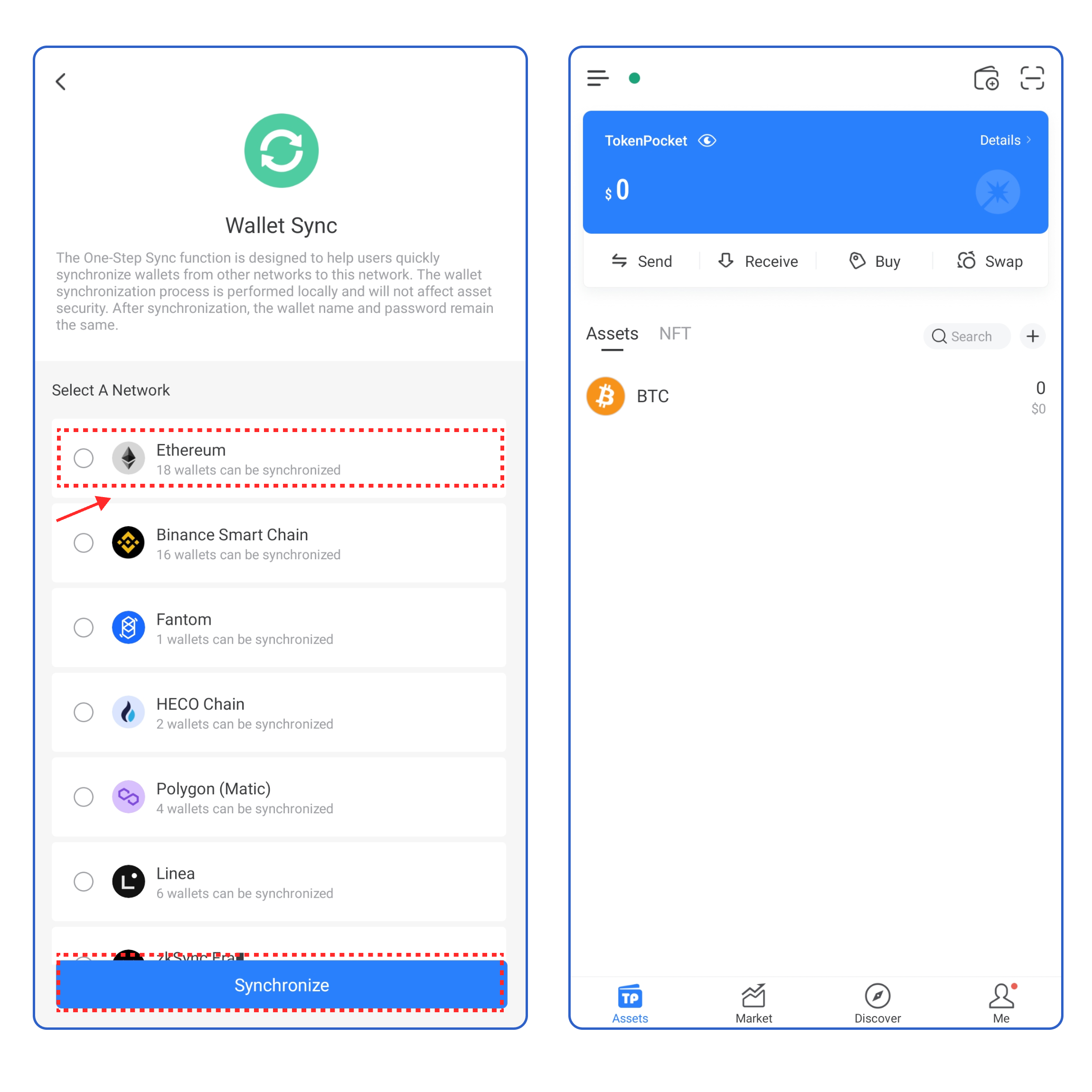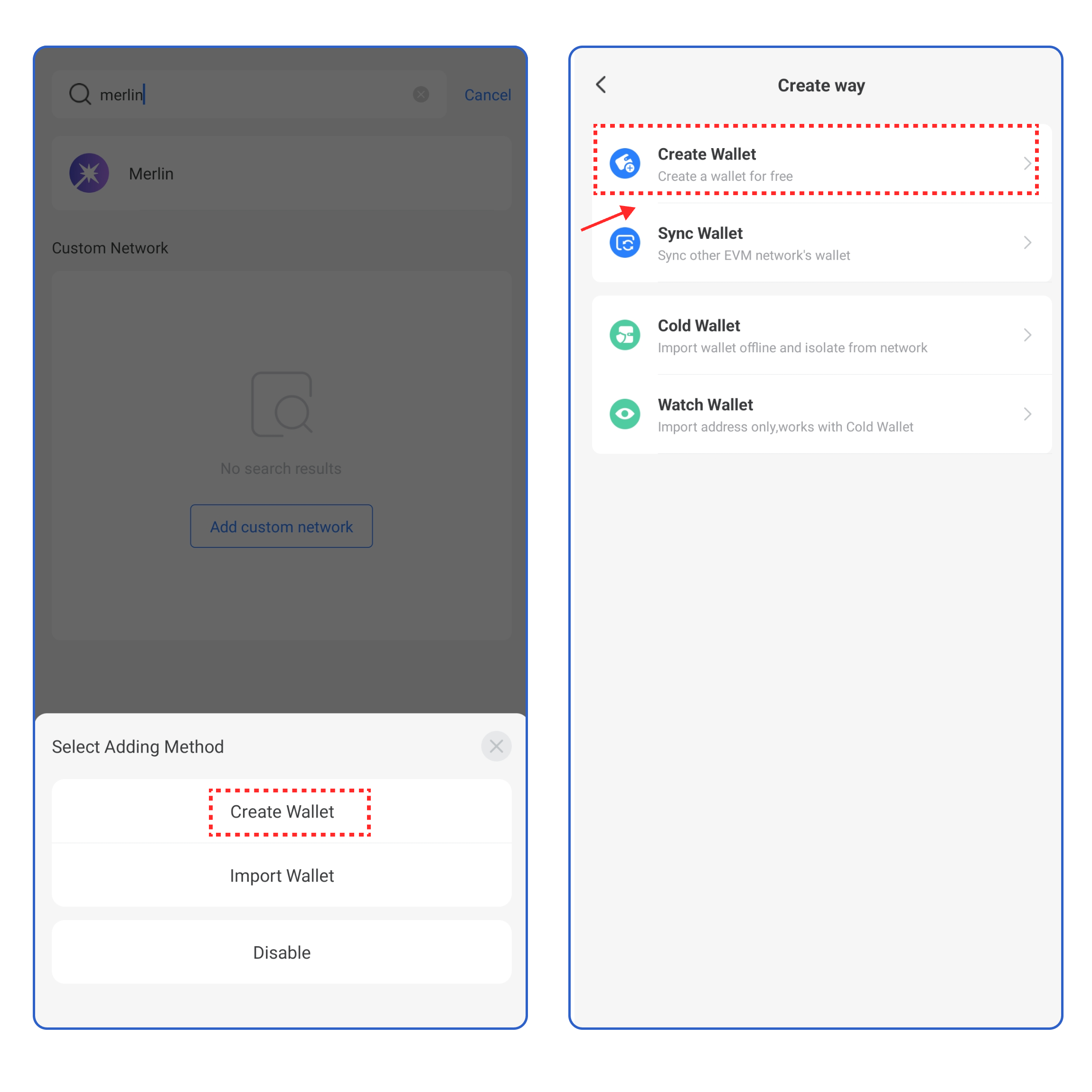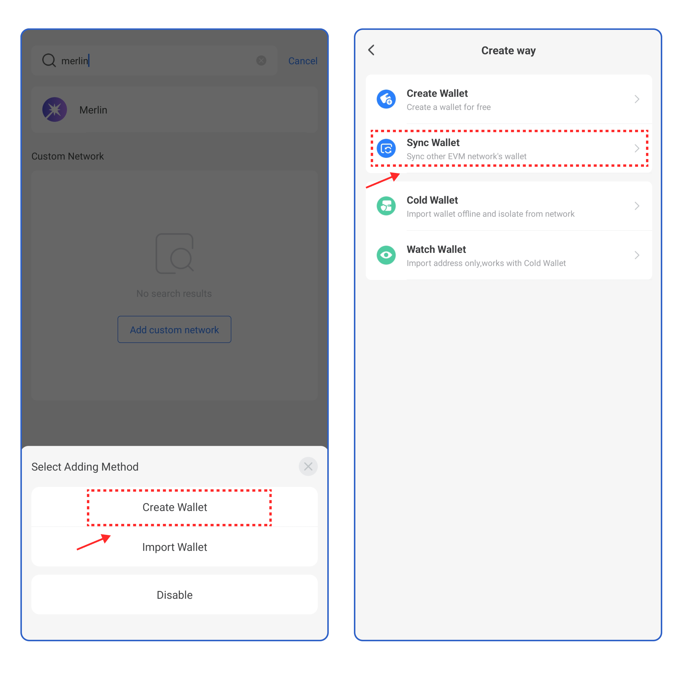 Select the network you want to sync and click【Synchronize】, you can view your wallet on Merlin Network.