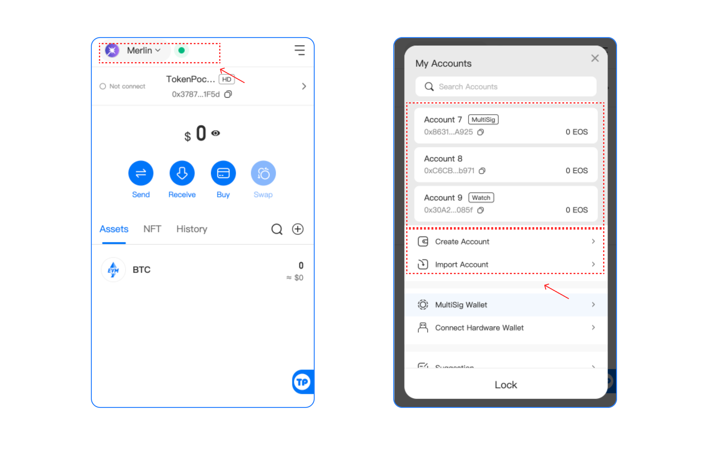 After you select, you can view your Merlin Wallet on the Assets page, click the upper right corner to access the management page, you can switch your wallet, and create/import a wallet on this page.