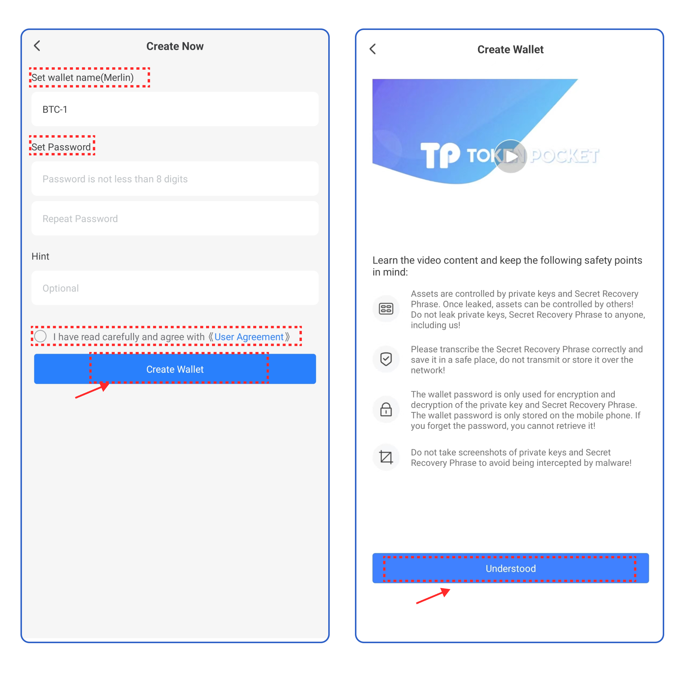 3. Set the wallet name and password, click the User Agreement, and click [Create Wallet]. Watch and learn the video content, click [Understood].
