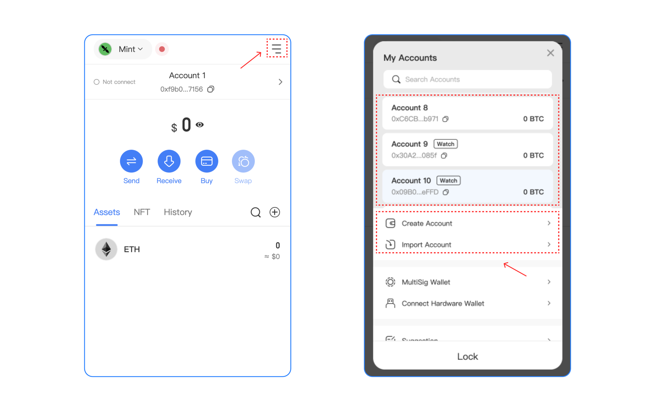 After you select, you can view your Mint Wallet on the Assets page, click the upper right corner to access the management page, you can switch your wallet, and create/import a wallet on this page.