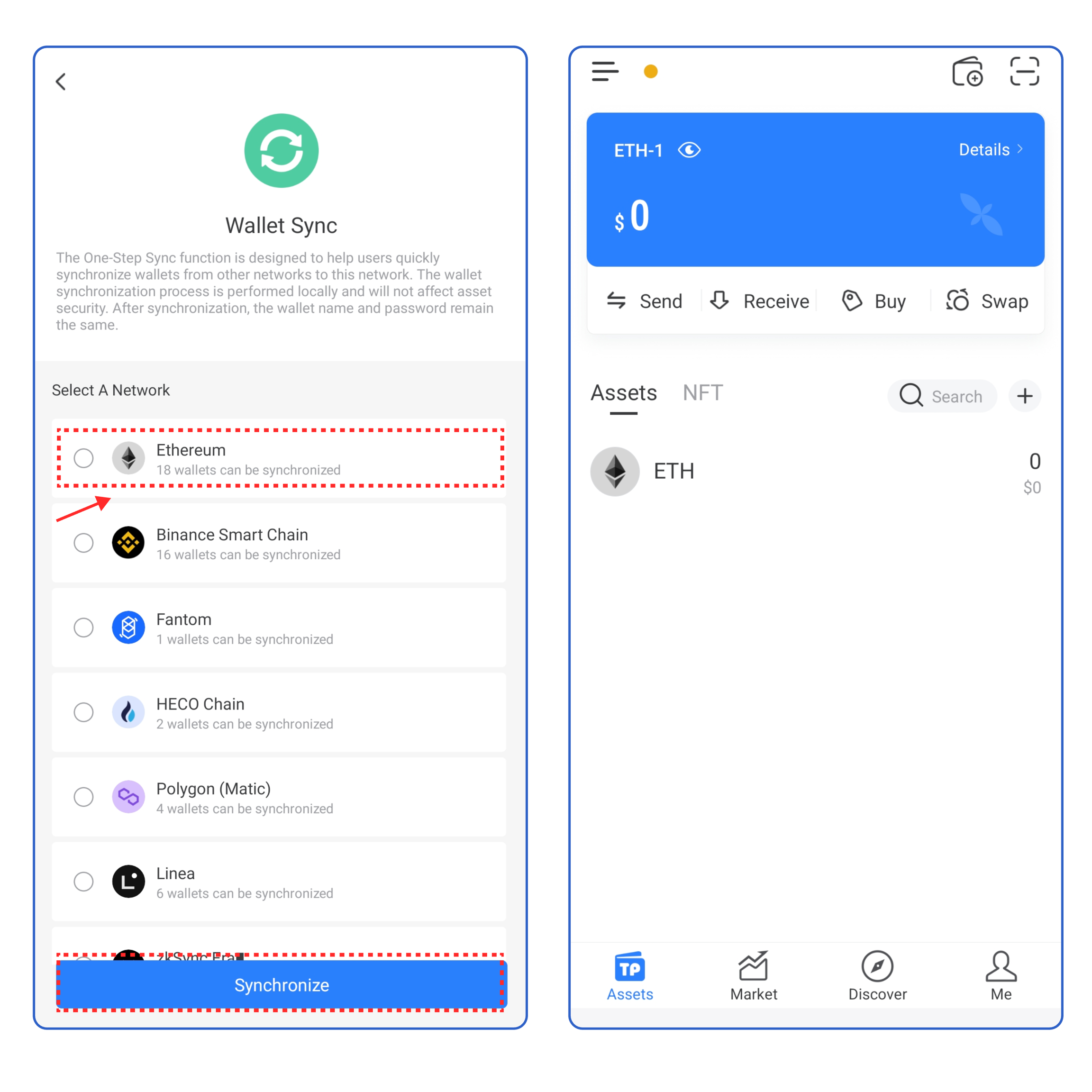 Select the network you want to sync and click 【Synchronize】, you can view your wallet on Mint Network.