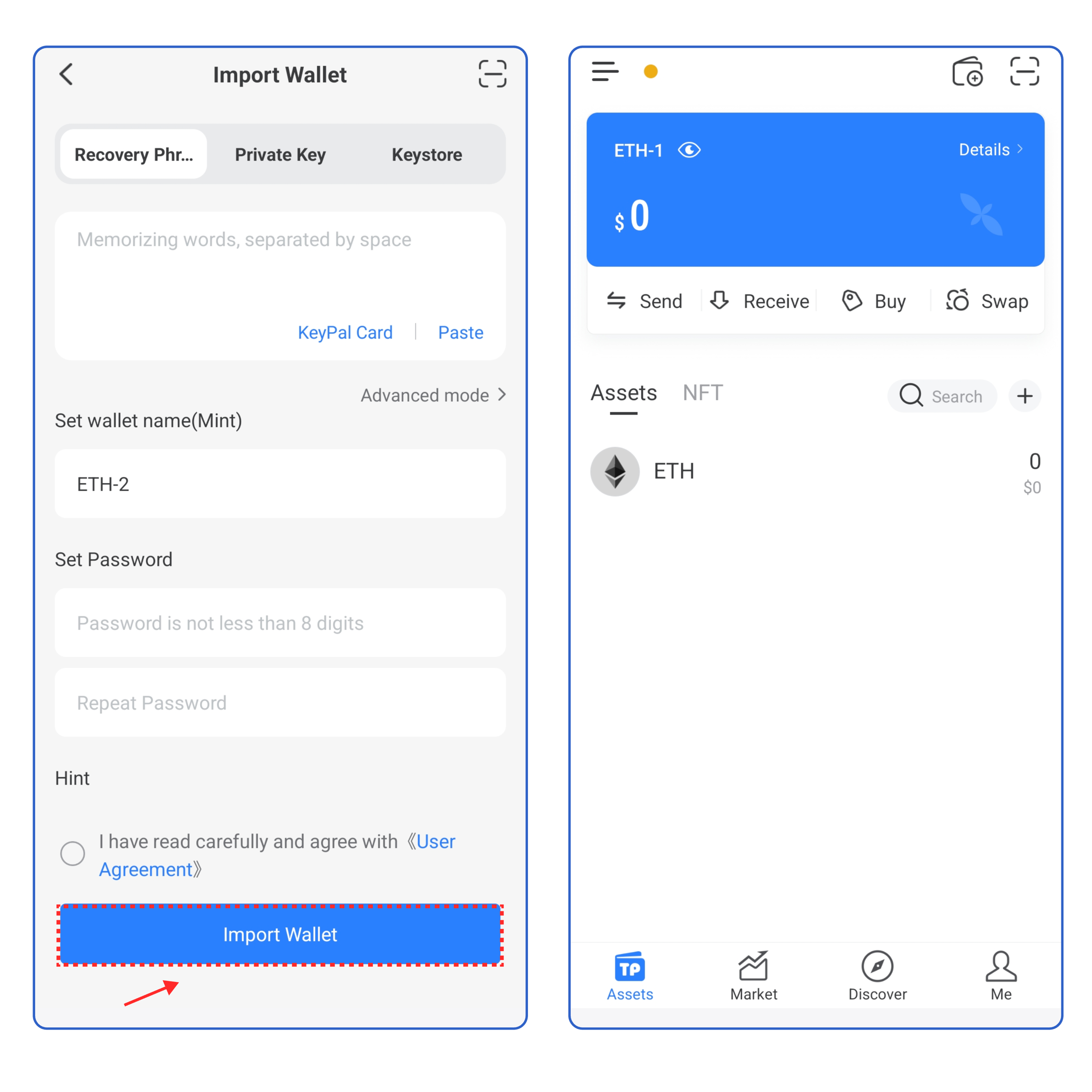 3. Take [Recovery Phrase import] as an example, enter your secret recovery phrase, wallet name, and password, click the User Agreement, and click [Import Wallet]. At this point, you have successfully imported a Mint wallet.