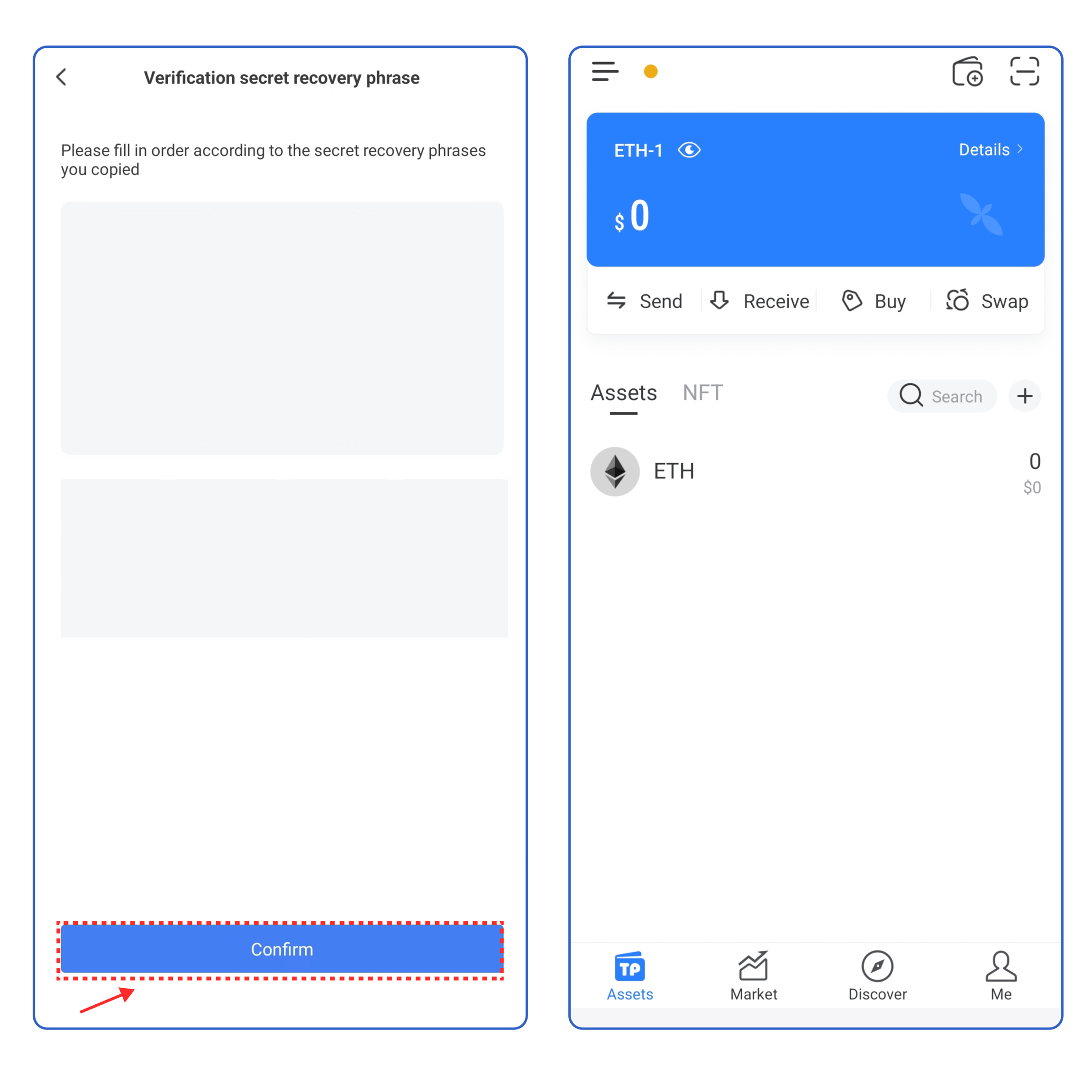 5. Enter your secret recovery phrase, and click [Confirm]. At this point, you have successfully created a Mint wallet.