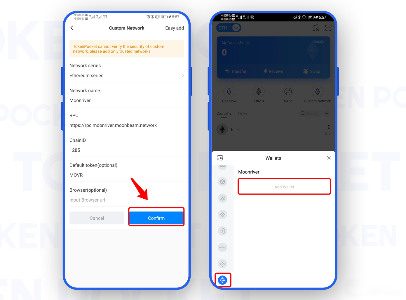 3. Enter the page of [Custom Network], click [Confirm], at this point, you have added the Moonriver Network successfully。