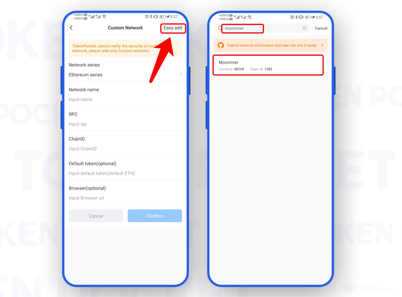 2. Click [Easy add], and search the [Moonriver], then the system will display the Moonriver Network,click [Moonriver];