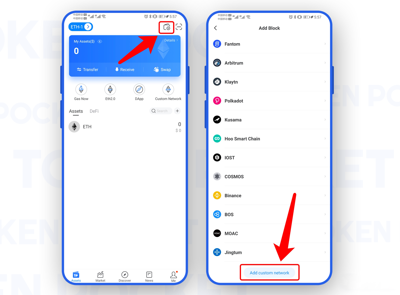 1. Open TokenPocket APP, click the [Wallet] pattern in the upper right corner, enter the page of [Add Block] and pull to the bottom, click [Add custom network];