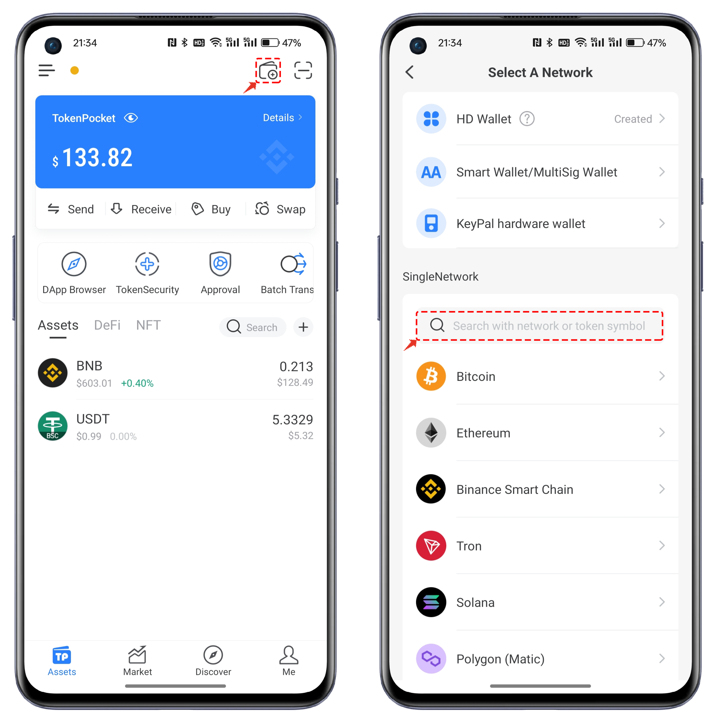 Open TokenPocket, click on the top right corner to add a wallet, search and select RGB from the list;