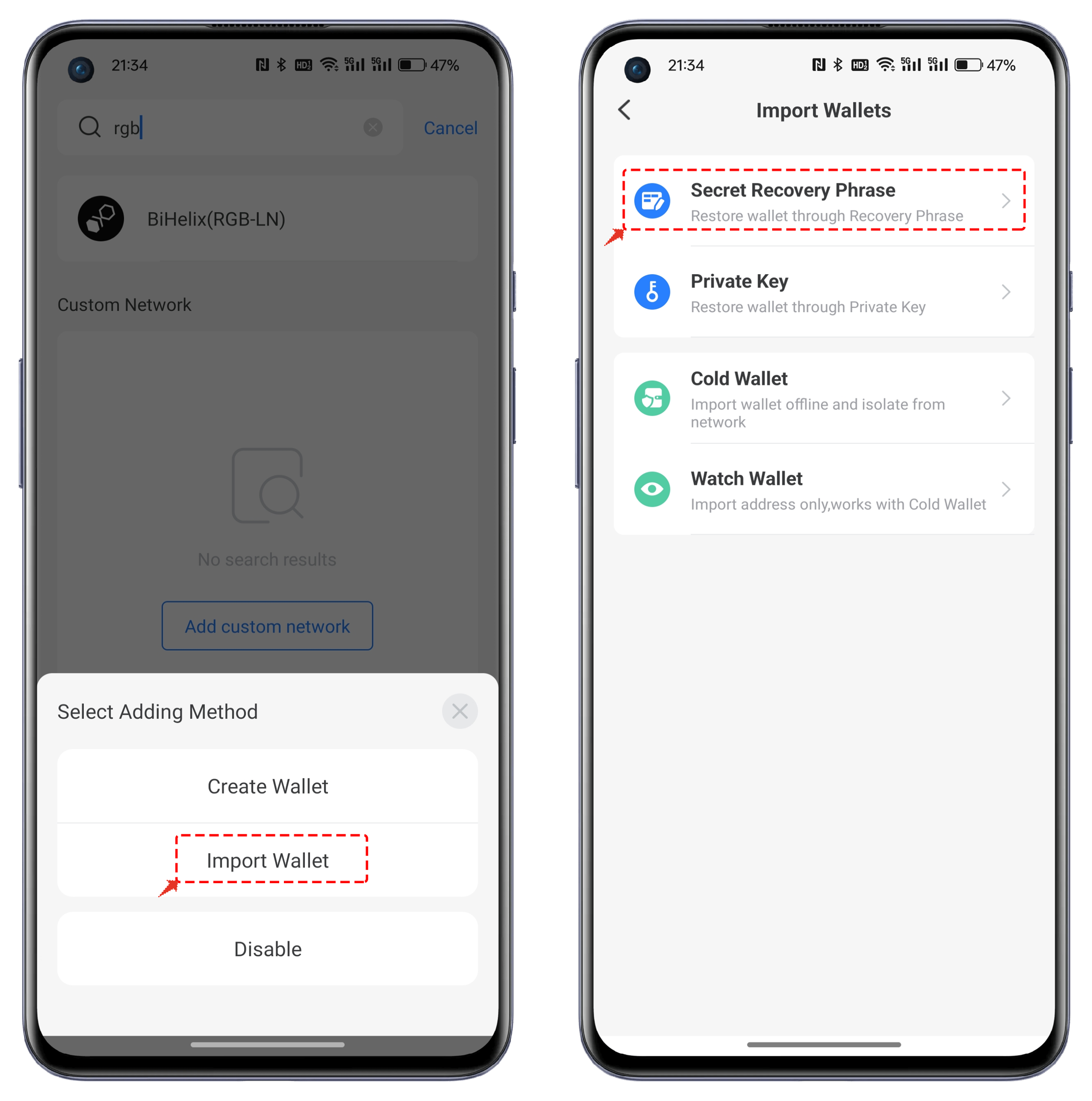 Click on "Import Wallet," and then choose either "Private Key Import" or "Secret Recovery Phrase Import.