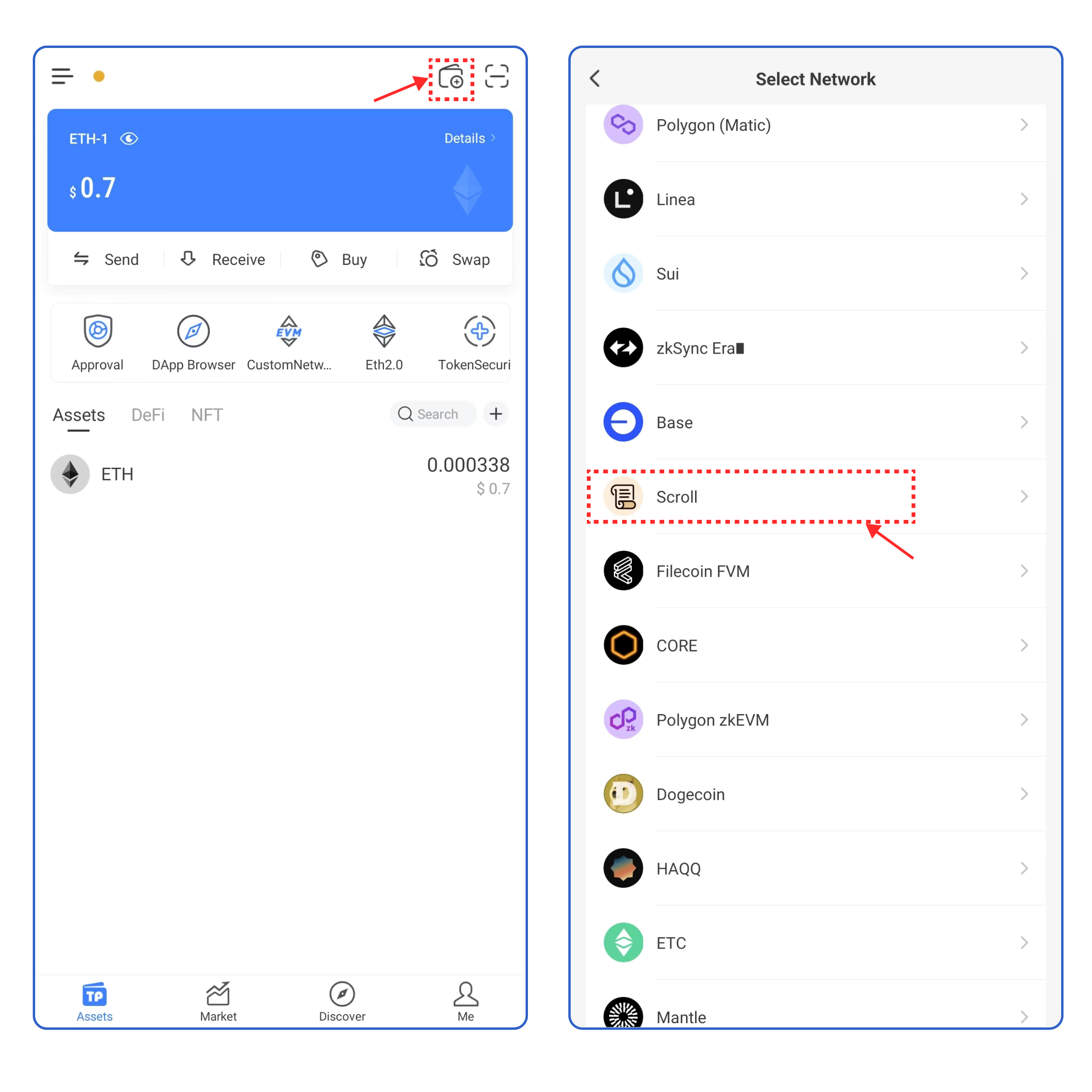 Open TokenPocket Chrome Extension, click the upper left corner to select the Scroll Network.