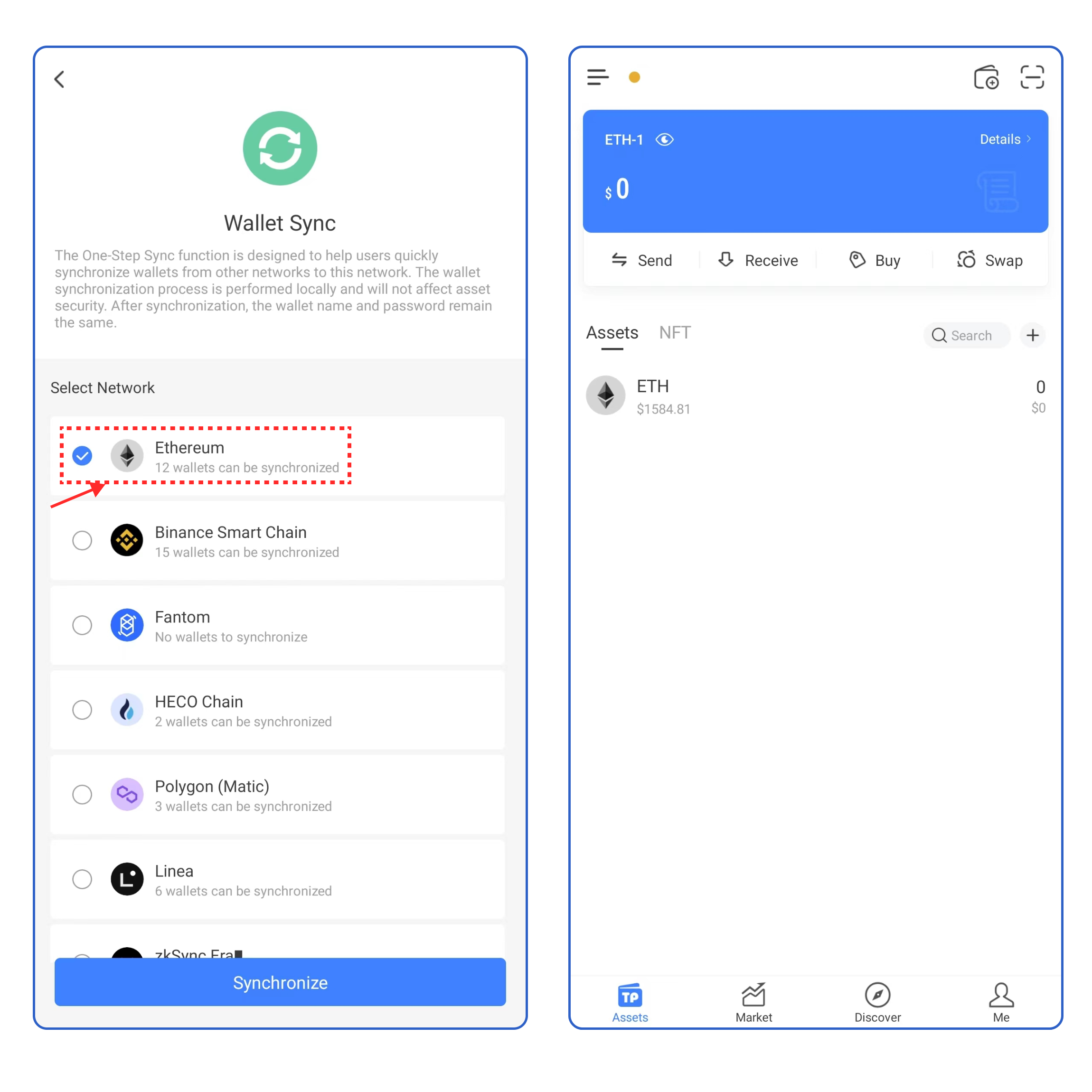 Select the network you want to sync and click【Synchronize】, you can view your wallet on Scroll Network.