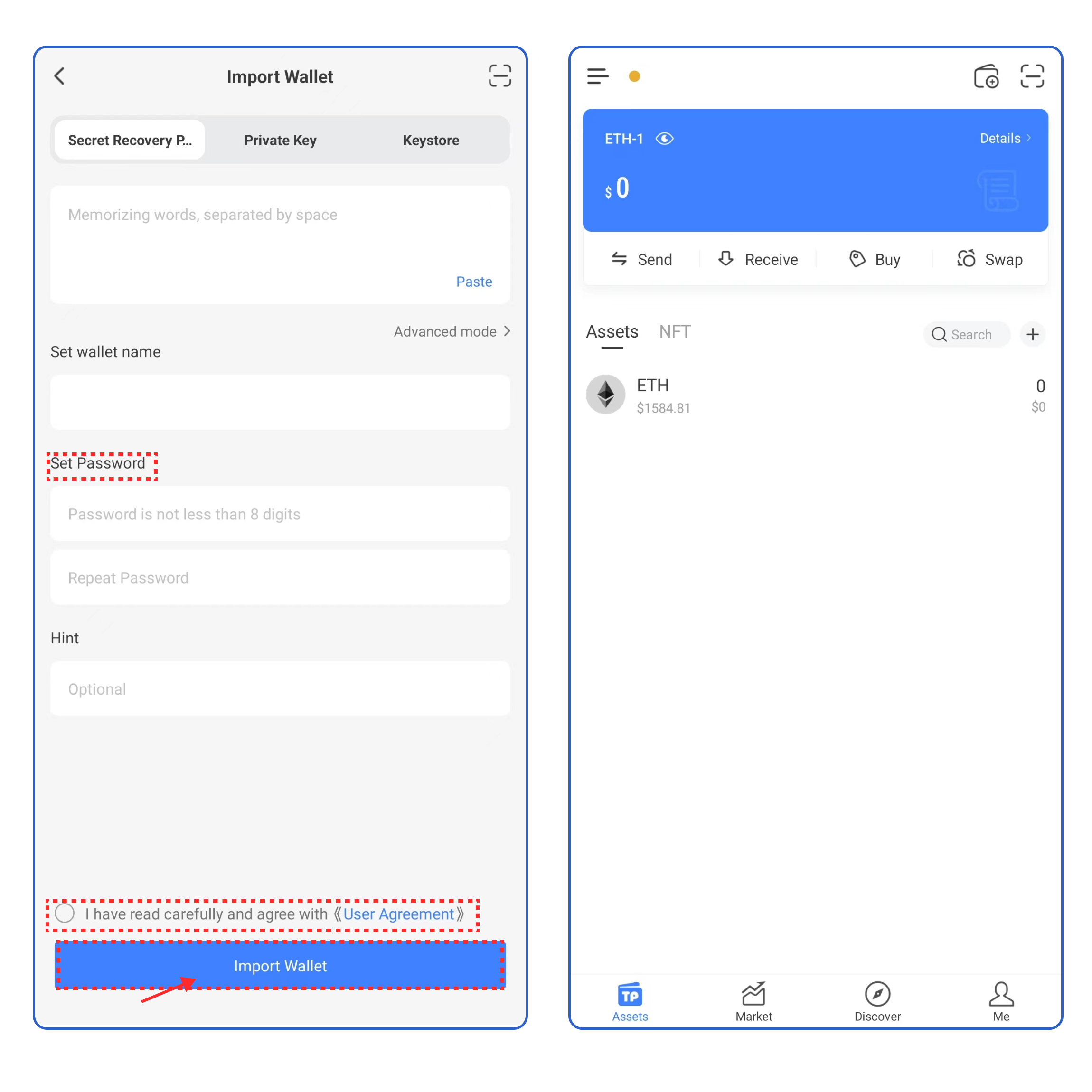 3. Take [Recovery Phrase import] as an example, enter your secret recovery phrase, wallet name, and password, click the User Agreement, and click [Import Wallet]. At this point, you have successfully imported a Scroll wallet.