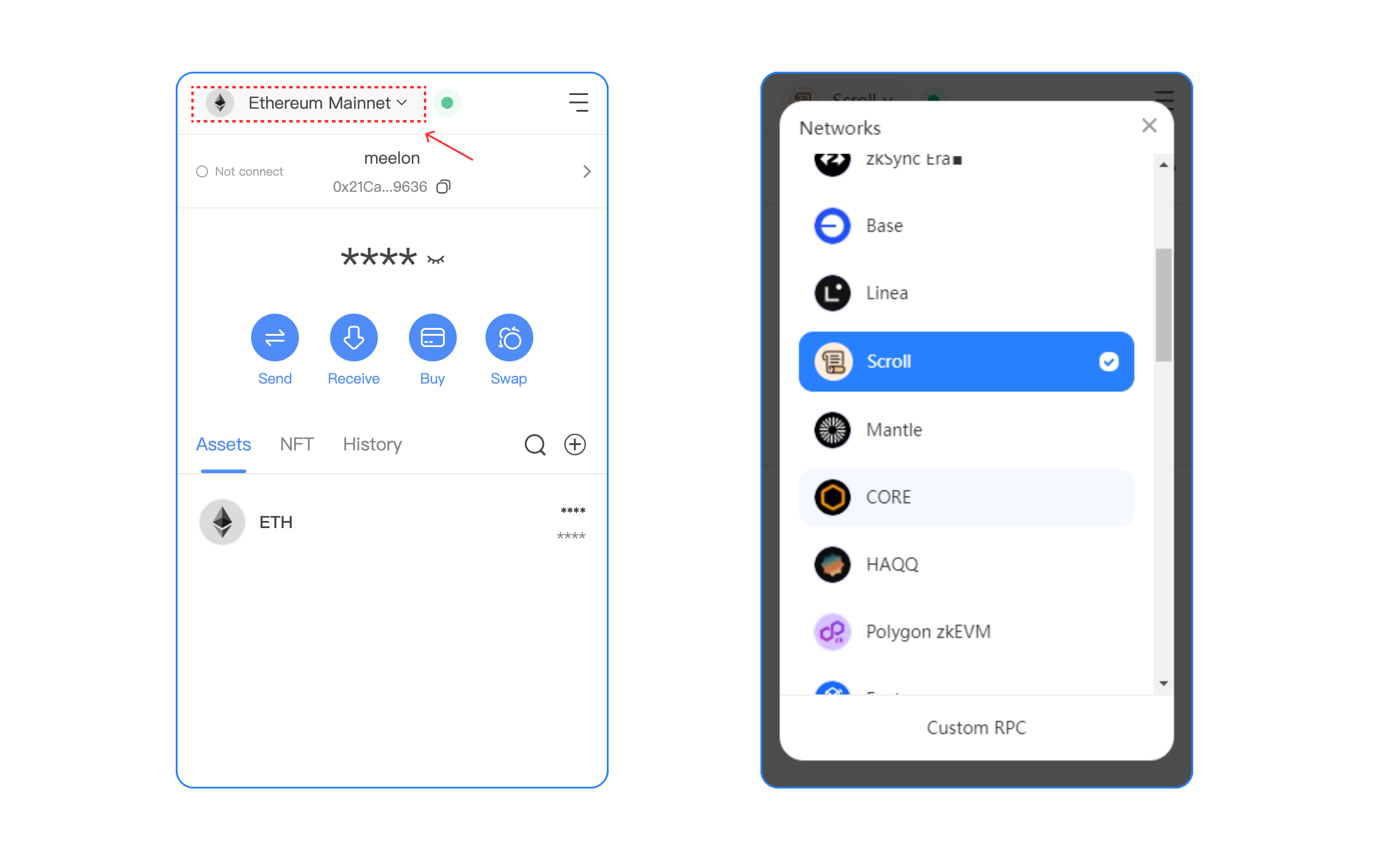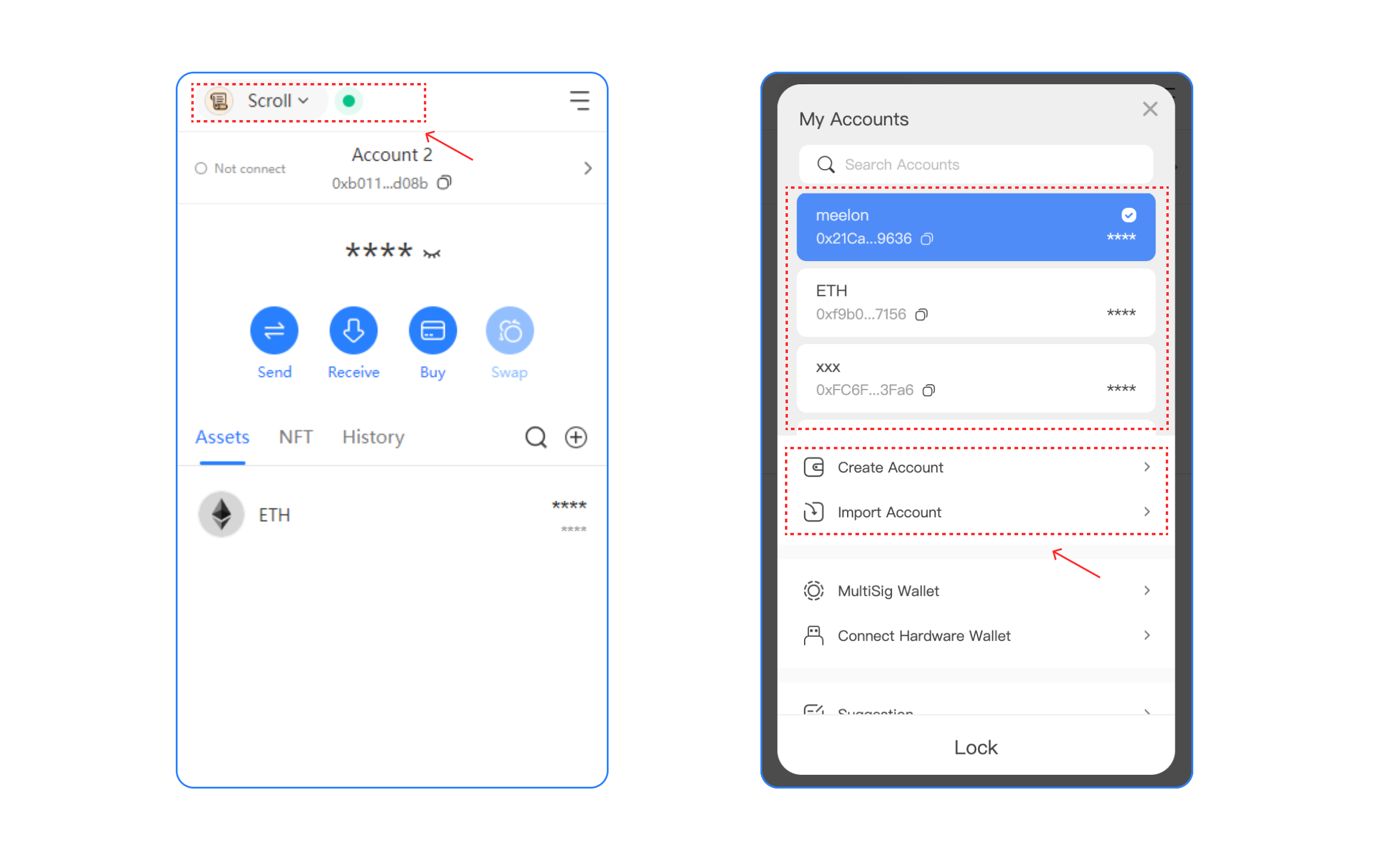 After you selected, you can view your Scroll Wallet on the Assets page, click the upper right corner to access the management page, you can switch your wallet, create/import wallet on this page.