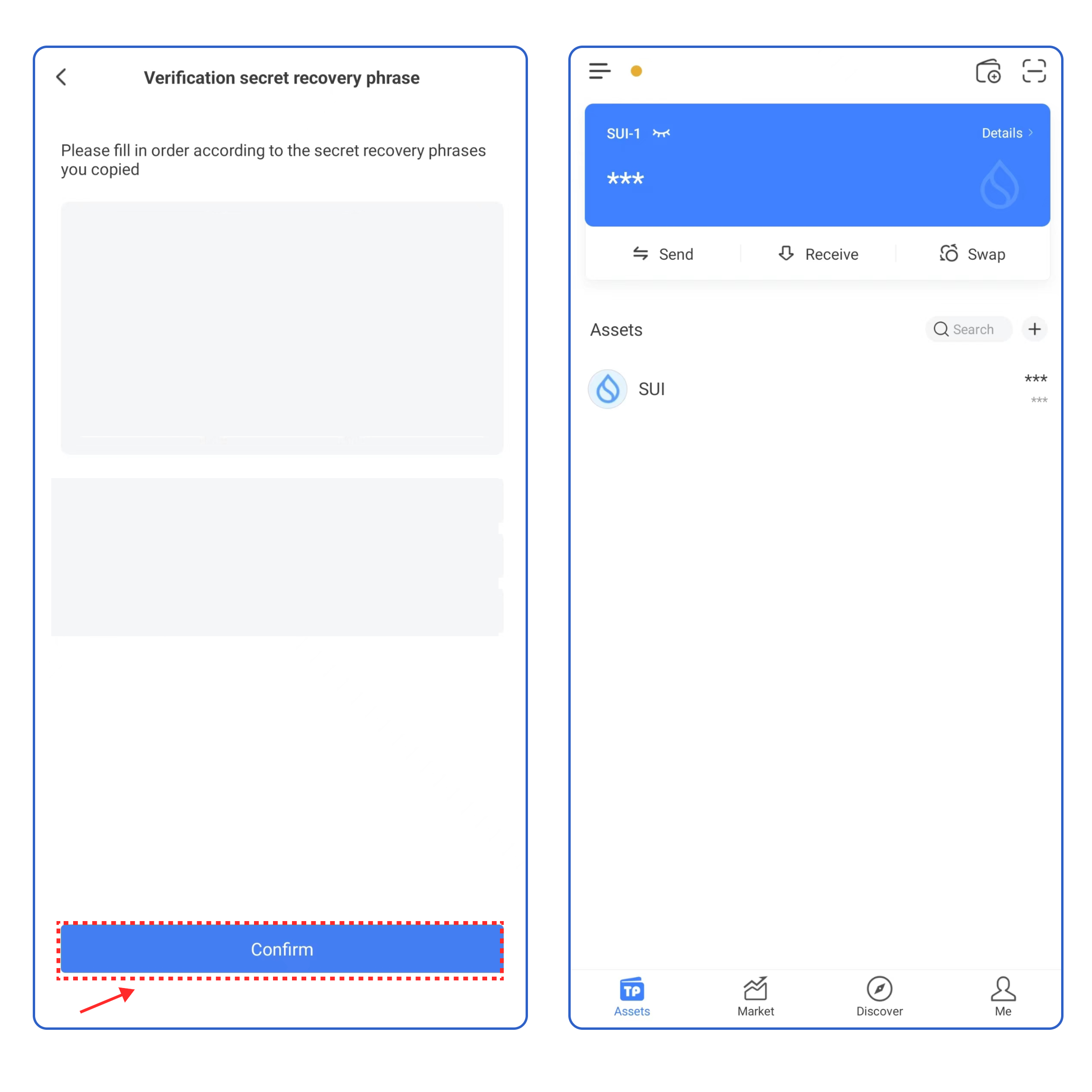 5. Enter your secret recovery phrase, and click [Confirm]. At this point, you have successfully created a Sui wallet.